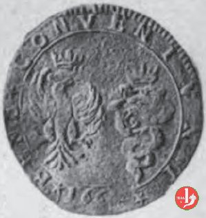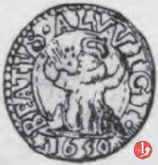 Soldo col Beato Luigi 1657 (tipo Casale) Obverse: FERDI • D • D • G • PRIN • CASTI • Aquila coronata a sinistra, ad ali spiegate. Il Beato Luigi, genuflesso, riceve le stimmate; in es., data. | |