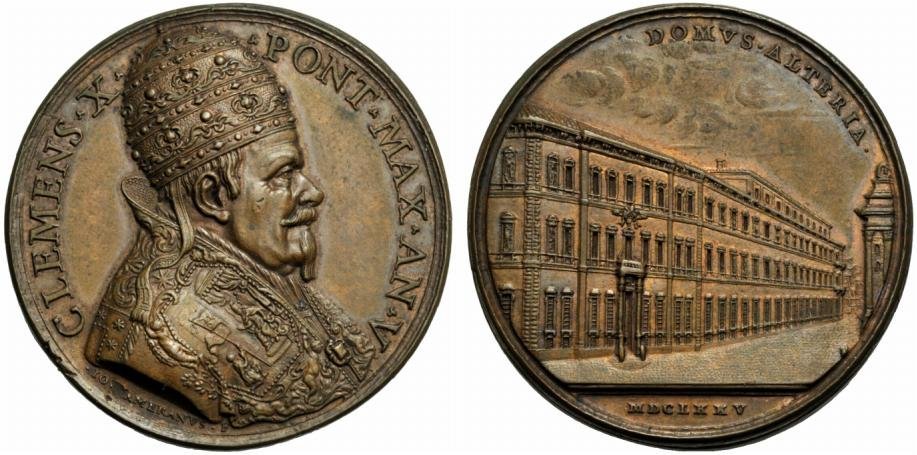 Palazzo Altieri -M56a Obverse: CLEMENS • X • _ • PONT • MAX • AN • VI • busto a dx con triregno e piviale vista prospettica di Palazzo Altieri in esergo: MDCLXXV | |