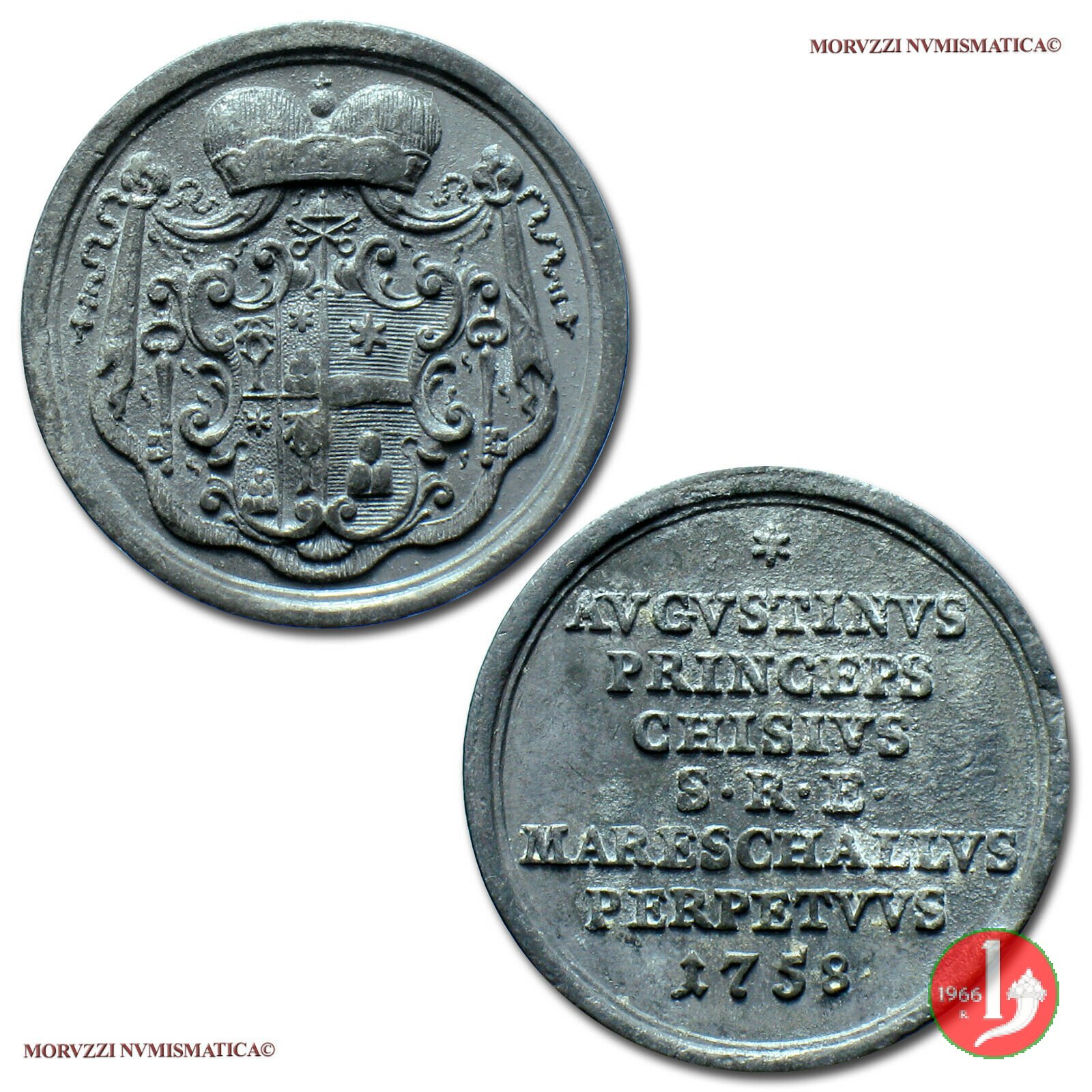 Principe Agostino Chigi Maresciallo Perpetuo -Bo63 Dritto: Stemma Chigi coronato, entro panneggio Verso: nel campo: * = AVGVSTINVS = PRINCEPS = CHISIVS = S • R • E • = MARESCHALLVS = PERPETVVS = 1758 |