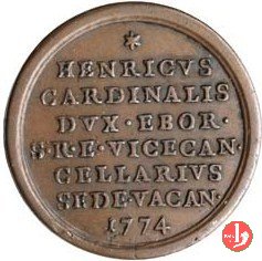 Vice Cancelliere Card. Duca di York -Bo72 Dritto: stemma del Card. Enrico Stuart Duca di York sormontato da corona e galero a sei nodi Verso: * = HENRICVS = CARDINALIS = DVX • EBOR • = S • R • E • VICECAN • = CELLARIVS = SEDE • VACAN • = 1774 | |