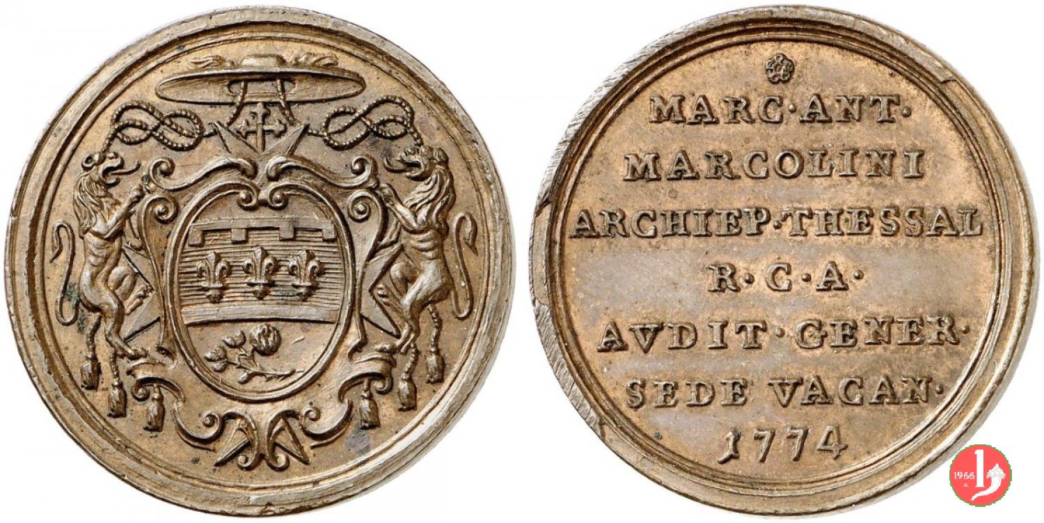 Uditore Generale Mons. Marcolini -Bo76 Dritto: Stemma sormontato da galero e affiancato da leoni rampanti Verso: * = MARCANT • = MARCOLINI = ARCHIEP • THESSAL = R • C • A • = AVDIT • GENER • = SEDE VACAN • = 1774 | |