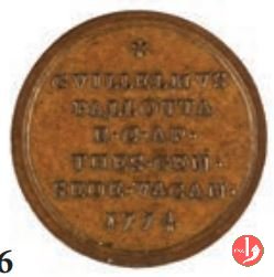 Tesoriere Generale Mons. Pallotta -Bo73 Dritto: Stemma di Mons. Guglielmo Pallotta tra volute e sormontato da galero a sei nodi Verso: nel campo: * = GVILLELMVS = PALLOTTA = R • C • AP • = THES • GEN • = SEDE • VACAN • = 1774 | |