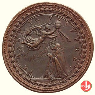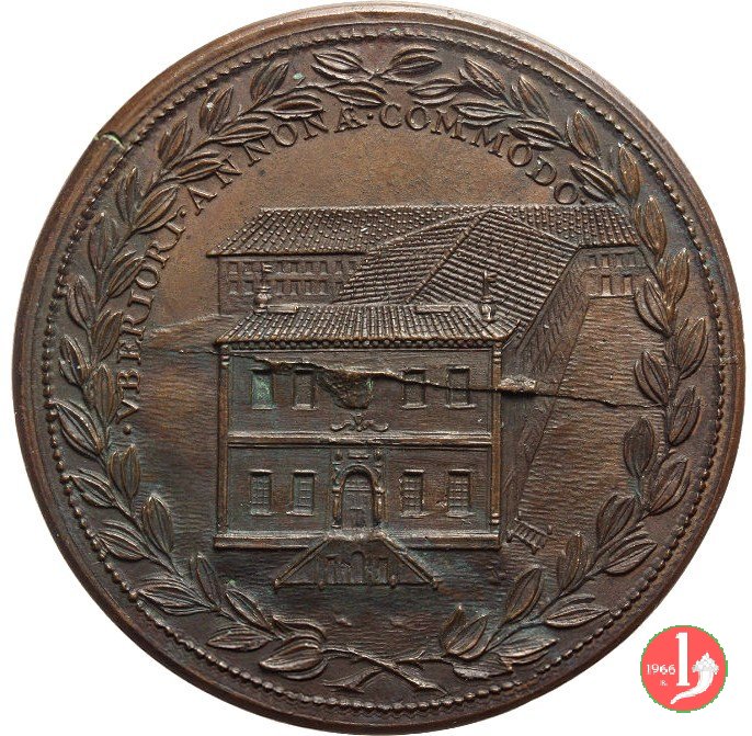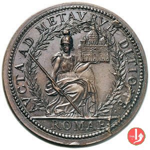 in corona d'alloro: figura simbolica di donna seduta verso dx con asta e Basilica di S. Pietro