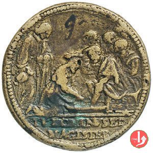 Verso: Gesú a sx nimbato e genuflesso lava i piedi a S. Pietro seduto su sgabello, attorno sei Apostoli