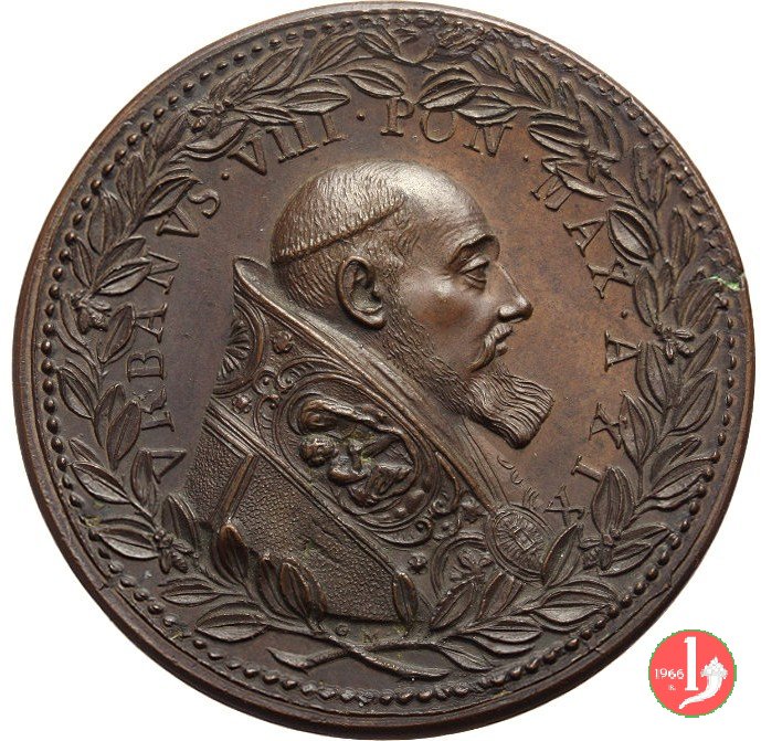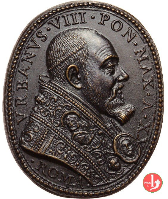 Verso: NATVS = FLORENTIAE = E GENTE BARBERINA = A • MDCXXIII • D • VI • AVGVST • = PONTIFEX M • ELECTVS = VIR MAGNI INGENII HAC PRVDENS = PACEM GALLIAE INTER ET HISPAN - REGG • = COMPOSVIT = PORTAM S • RESERVAVIT ET CLVSIT A • MDCXXV • = S • PETRI BASILICAM CONSECRAVIT = PORTVM CENTVM CELLAS = ABSOLVIT = S • S • PETRI ET PAVLI SEPOLCRVM ORAVIT = QVIRINALI PALATIO = MVLTA AEDIFICIA ADDIDIT = A • MDCXLIV • D • XXIX • IVL • =