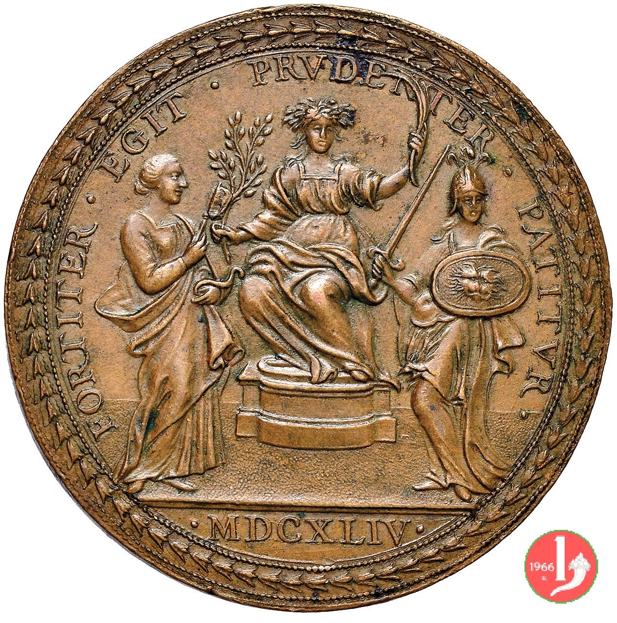 Verso: colonna sopra ad ape ornata da due rami d'ulivo laterali = ANNA • COL • PHIL • COL = DVCIS • PAL • ET • C • = FILIA • VXOR • THAD • = BARB • VR • PRAEF • VRB = VIII • NEP • ET • C • AED • = CAELI • REGINAE • IN = SIGNV • SVAE = PIET • D • 1643 = ape