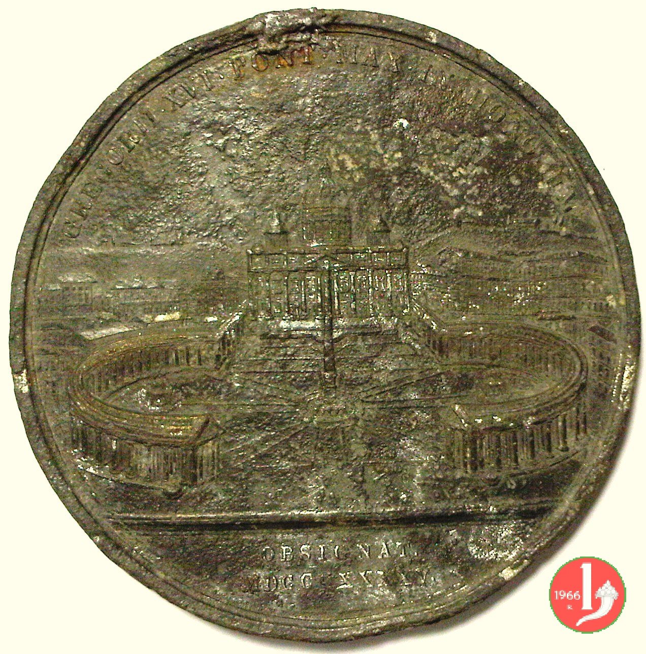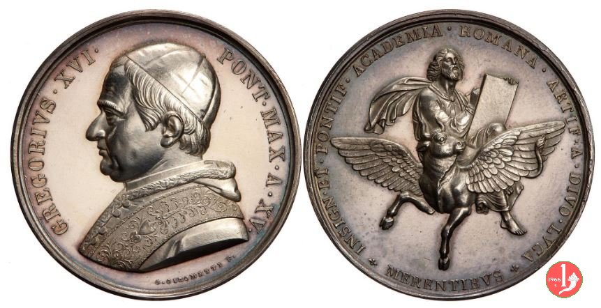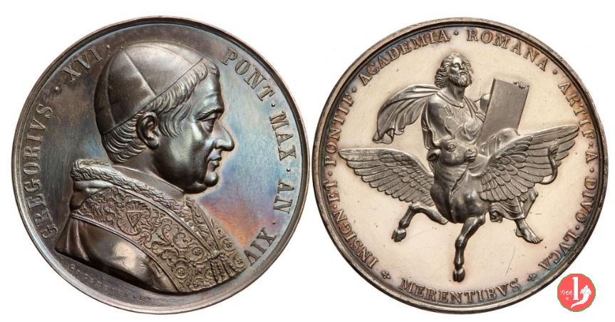 Premio Accademia di San Luca Obverse: GREGORIVS • XVI • _ PONT • MAX • A • XV • busto a sx con berretto, mozzetta e stola sotto: G • GIROMETTI • F • San Luca sul toro alato dipinge tela verso sx | |