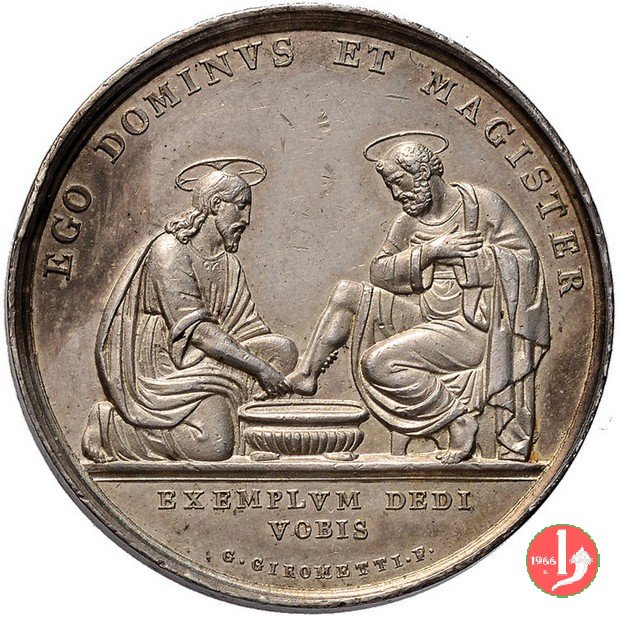 Lavanda dei piedi - A . XV -Bo196 Obverse: GREGORIVS • XVI • _ PONT • MAX • A • XV • busto a dx con berretto e piviale sotto: GIROMETTI • F • Gesú genuflesso a dx lava i piedi a S. Pietro seduto a sx in esergo: EXEMPLVM DEDI = VOBIS = G • Girometti • F • | |