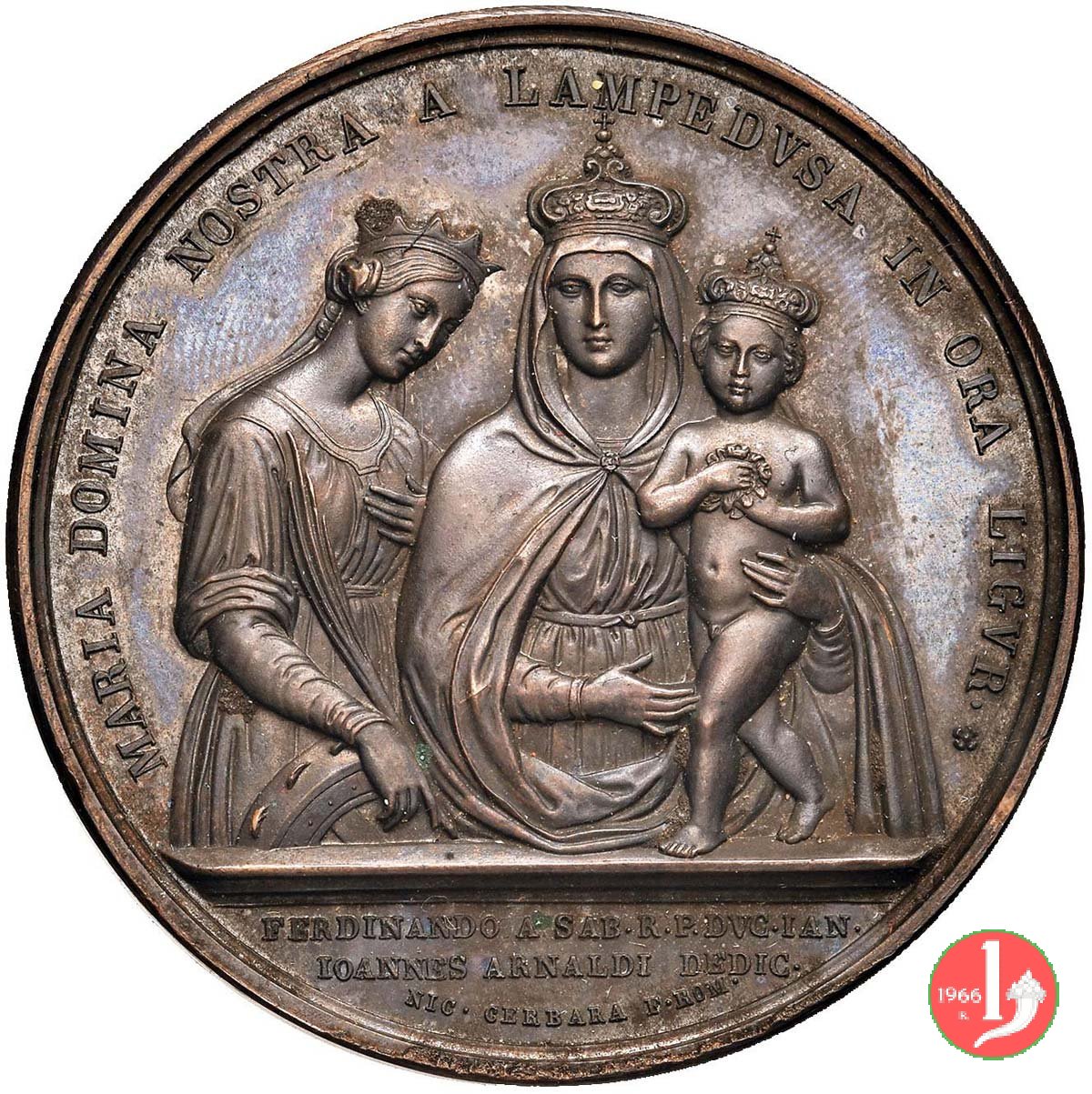 Incoronazione Madonna di Lampedusa in Castellano -Bo198 Obverse: MARIA DOMINA NOSTRA A LAMPEDVSA IN ORA LIGVR • * busto della Madonna coronata, paludata e velata col Bambino coronato in piedi a dx e Santa Caterina d'Alessandria a sx in esergo: FERDINANDO A SAB • R • P • DVC • IAN • = IOANNES ARNALDI DEDIC • in basso, circolarmente: NIC • CERBARA F • ROM • nel campo: AVREA CORONA = DECRETO COLLEGII = CAN • BASIL • VATIC • = PER IOANNEM B • ARNALDI = ANTISTITTEM VRB • = D • AN • M • DCCC • XXXXV • sotto: steli di giglio e rosa decussati | |