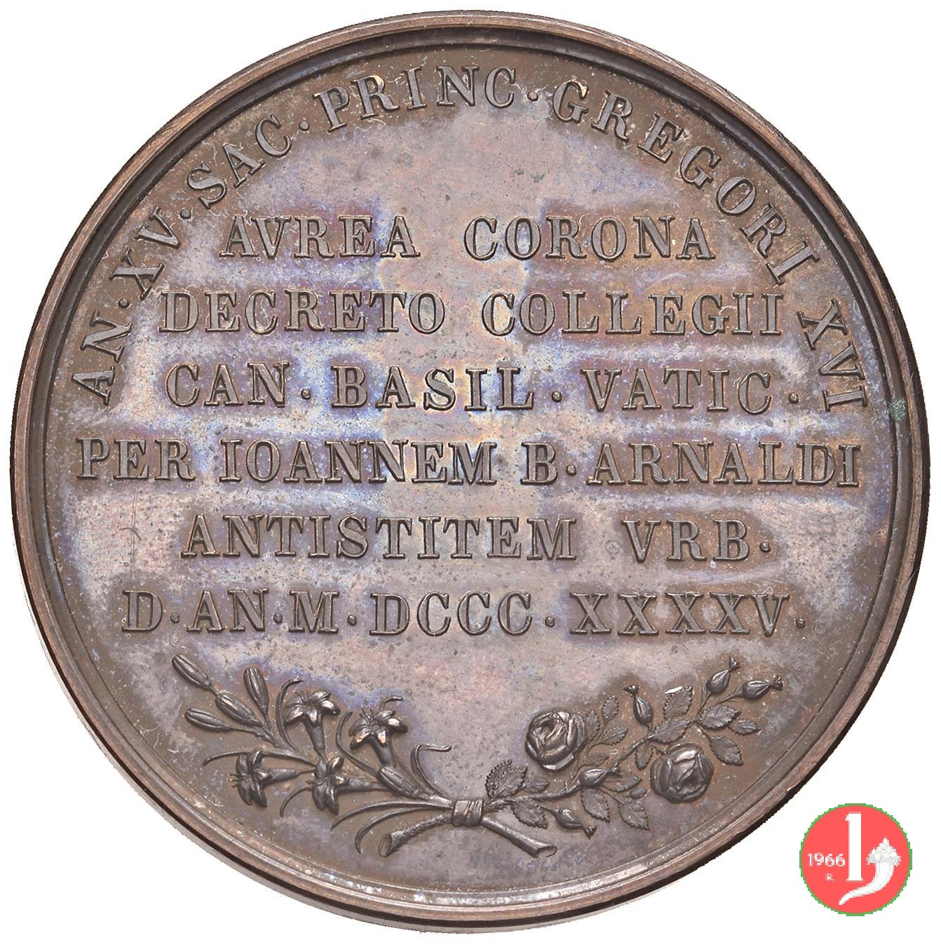 Madonna di Lampedusa -P99nota Obverse: B • MARIAE A LAMPEDVSA AVREA CORONA DONATAE L'immagine della Madonna sotto: IOAN • BAPT • ARALDI ANTIST • VRB • 1845 nel campo: AVREA CORONA = DECRETO COLLEGII = CAN • BASIL • VATIC • = PER IOANNEM B • ARNALDI = ANTISTITTEM VRB • = D • AN • M • DCCC • XXXXV • | |
