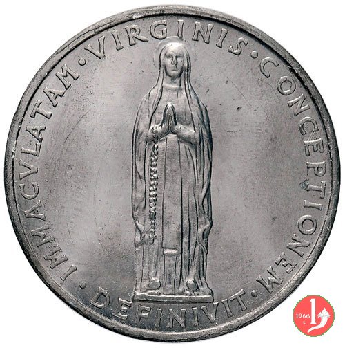Centenario Dogma dell'Immacolata 1954 Obverse: busti di Pio XII, Pio IX radiato, Pio X sotto: vista frontale di Piazza san Pietro sotto in nastro: PIVS • XII _ PIVS • IX _ PIVS • X busto raggiante dell'Immacolata di fronte con mani giunte | |