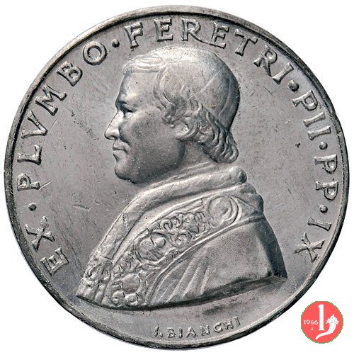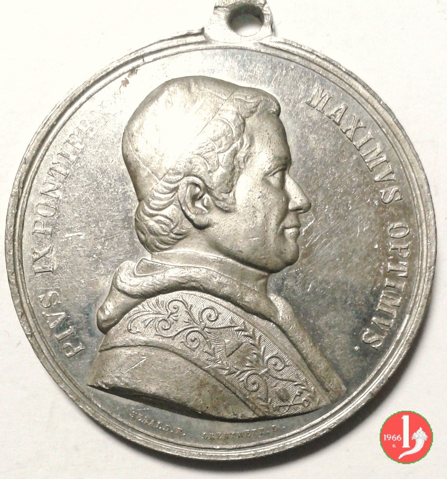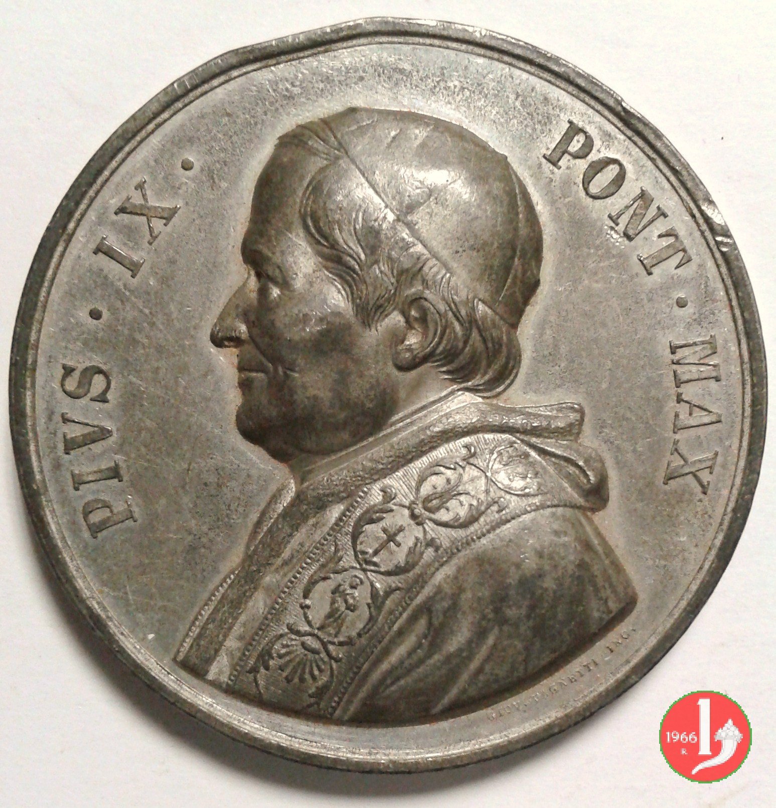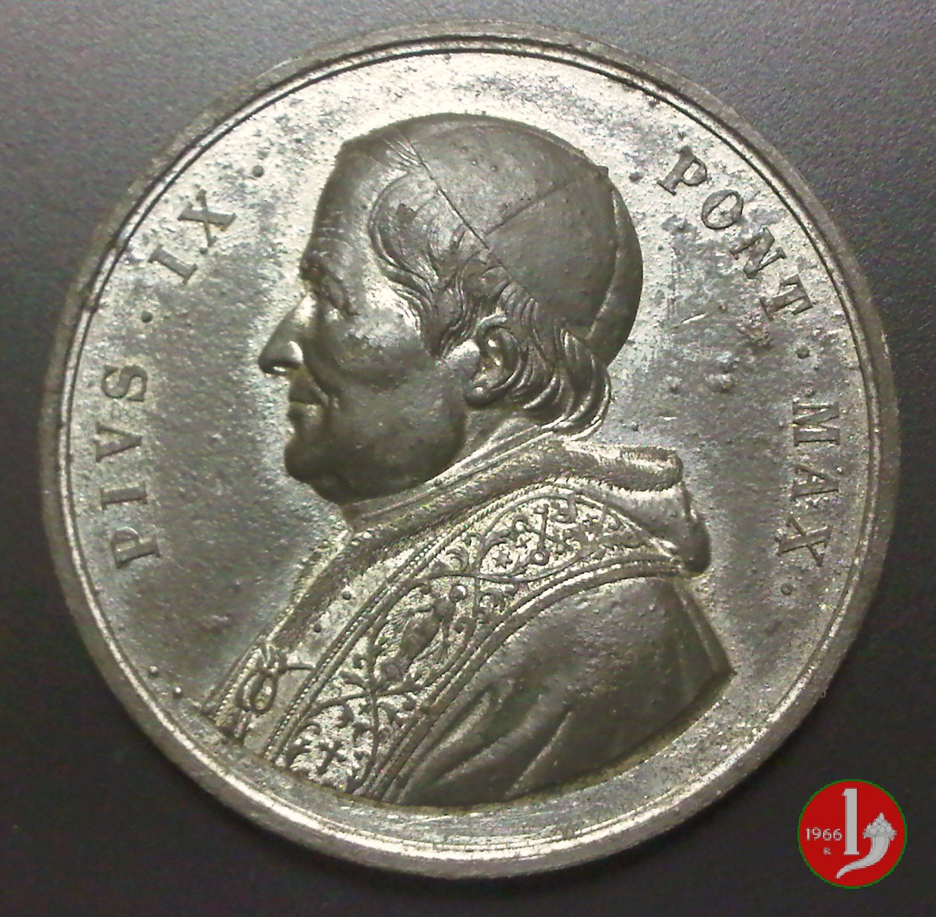 Verso: NASCITA 13 MAG. 1792 _ PONTIFICATO 16 GIUGNO 1846 _ CONCEZIONE 8 XBRE 1854 _ CENT. DI S. PIETRO 29 GIUG. 1867 _ CONC. VATIC. 8 XBRE 1869 = INFALLIBILITA' 18 LUGL. 1870 _ GIUB. PONTIFIC. 1871 _ GIUB. EPISC. 3 GUIG. 1877