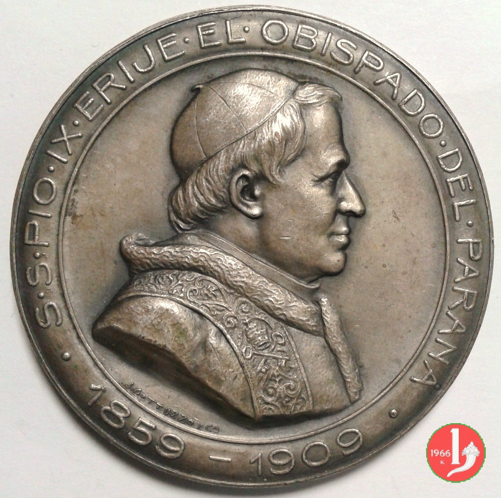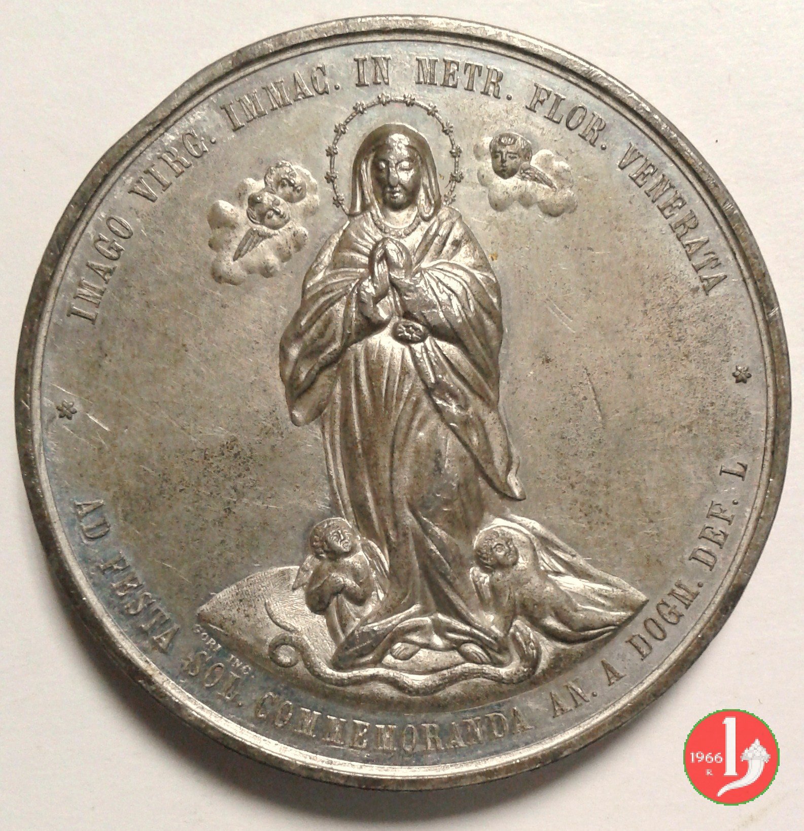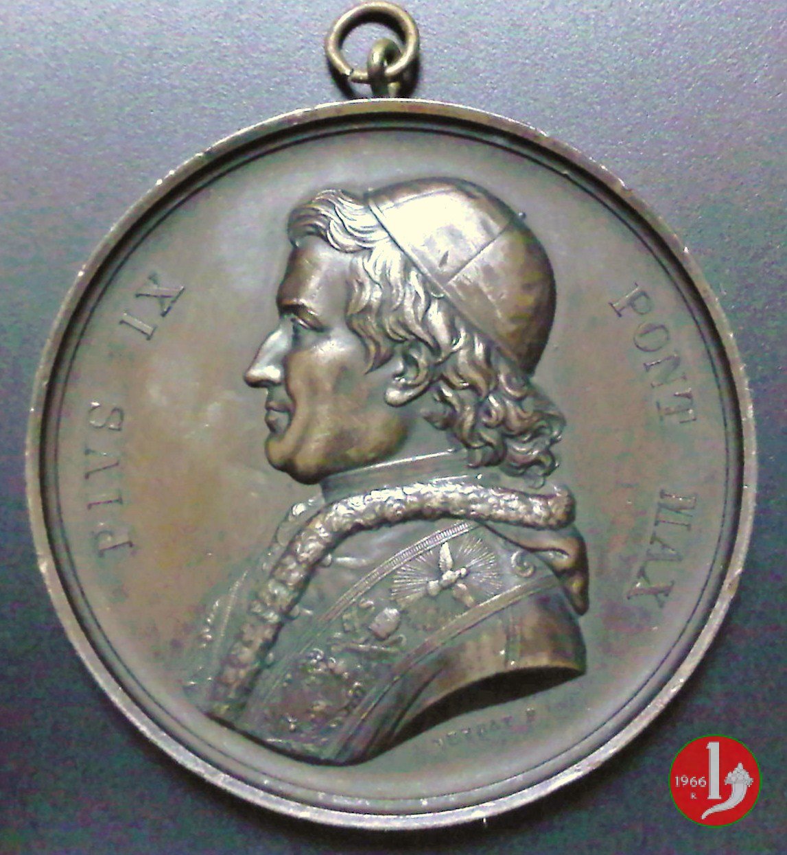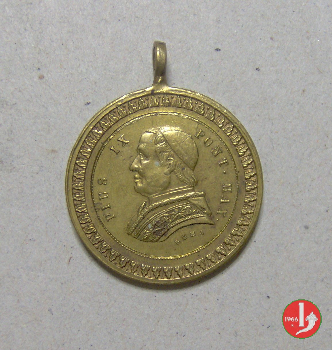 Verso: NASCITA 13 MAG. 1792 _ PONTIFICATO 16 GIUGNO 1846 _ CONCEZIONE 8 XBRE 1854 _ CENT. DI S. PIETRO 29 GIUG. 1867 _ CONC. VATIC. 8 XBRE 1869 = INFALLIBILITA' 18 LUGL. 1870 _ GIUB. PONTIFIC. 1871 _ GIUB. EPISC. 3 GUIG. 1877