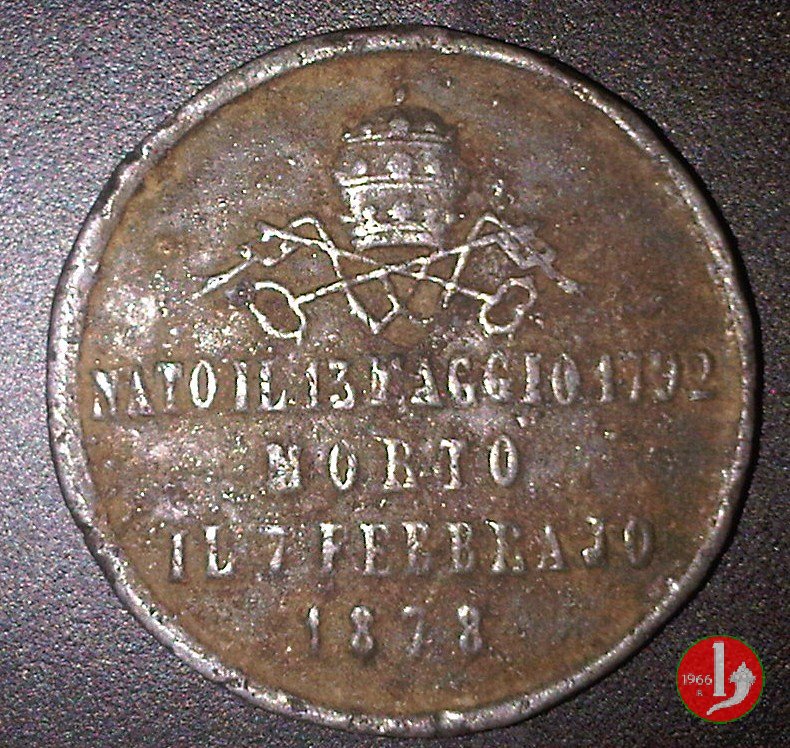 Verso: triregno con chiavi e nastri = NATO IL 13 MAGGIO 1792 = MORTO = IL 17 FEBBRAIO = 1878