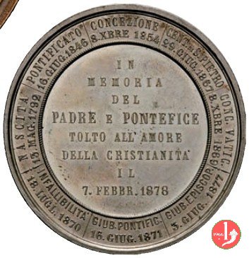 al centro: IN = MEMORIA = DEL = PADRE E PONTEFICE = TOLTO ALL'AMORE = DELLA CRISTIANITA' = IL = 7 FEBBR. 1878