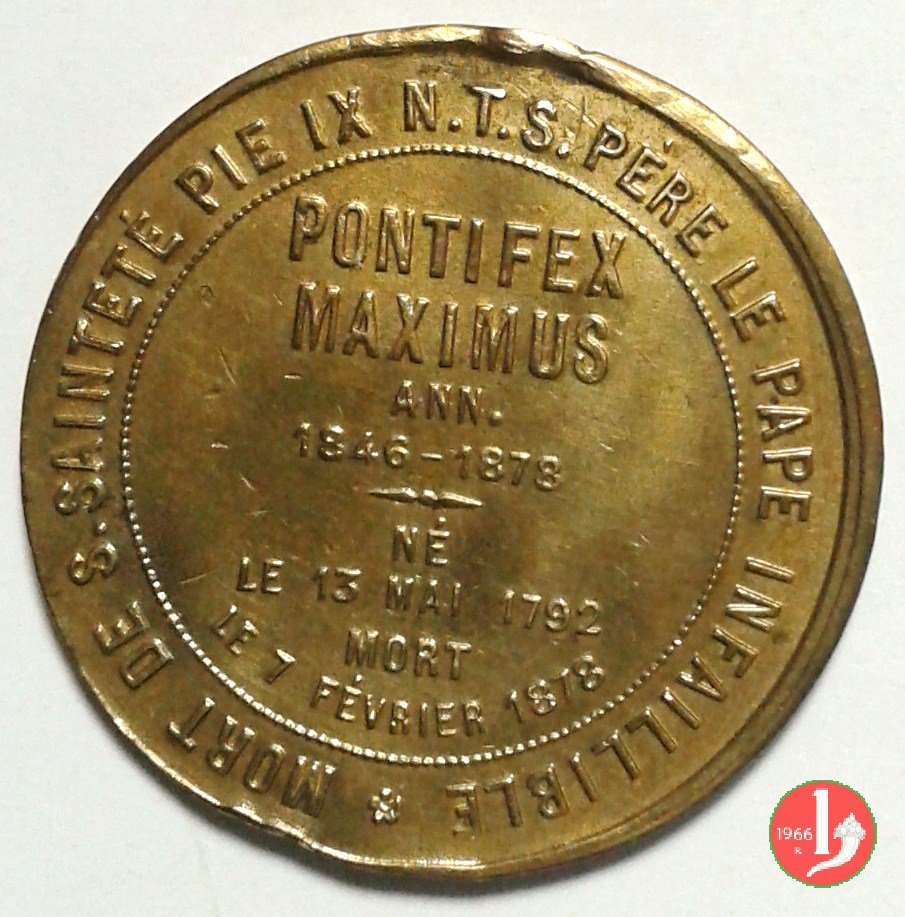 Verso: ZUM ANDENKEN AN. S. HL. PABST PIUS IX. GEBOR. D. 13. MAI 1792 * = GEWAHLT D 16 JUNI 1846. GEST • D • 7 • FEBR • 1878 rami di palma decussati