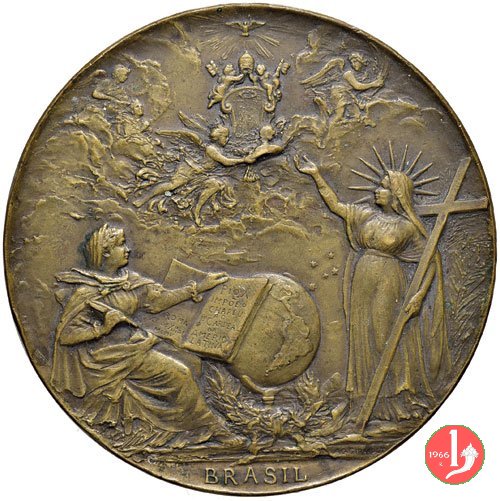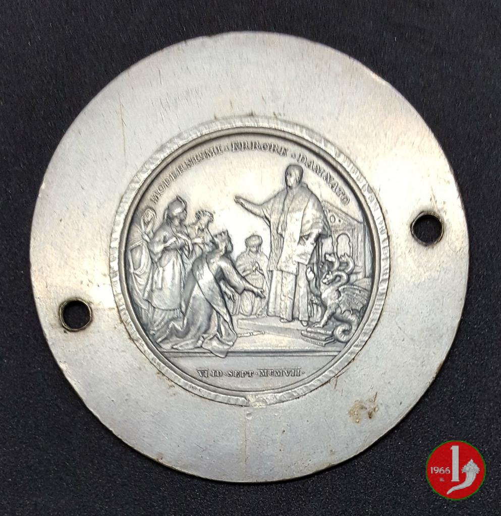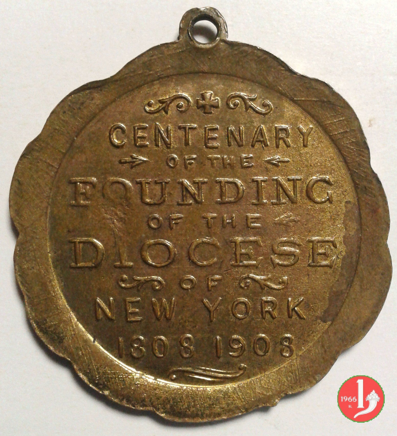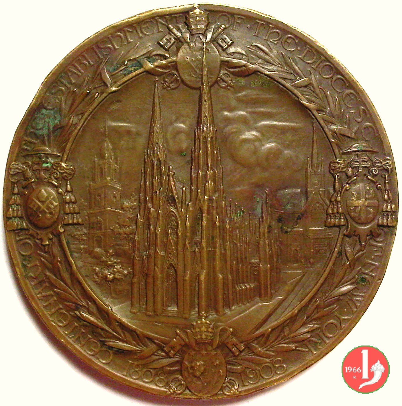 Verso: nel campo: ✠ tra fregi = CENTENARY = > OF THE < = FOUNDINC = > OF THE < = DIOCESE = OF = NEW YORK = 1808 1908