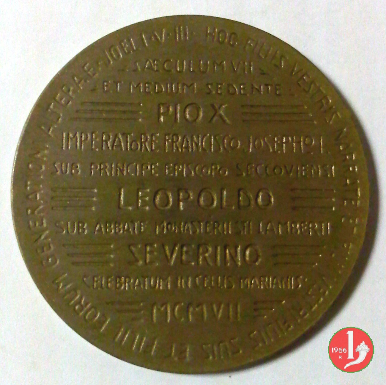 nel campo: SAECULUM VII = ET MEDIUM SEDENTE = PIO X (tra tre barre orizzontali) = IMPERATORE FRANCISCO JOSEPHO I = SUB PRINCIPE EPISCOPO SECCCOVIENSI = LEOPOLDO (tra tre barre orizzontali)= SUB ABBATE MONASTERII ST. LAMBERTI = SEVERINO (tra tre barre orizzontali)= CELEBRATUM IN CELLIS MARIANIS = MCMVII (tra tre barre orizzontali)