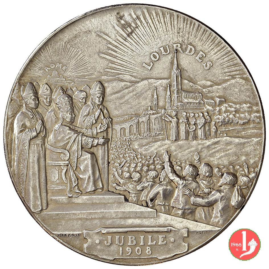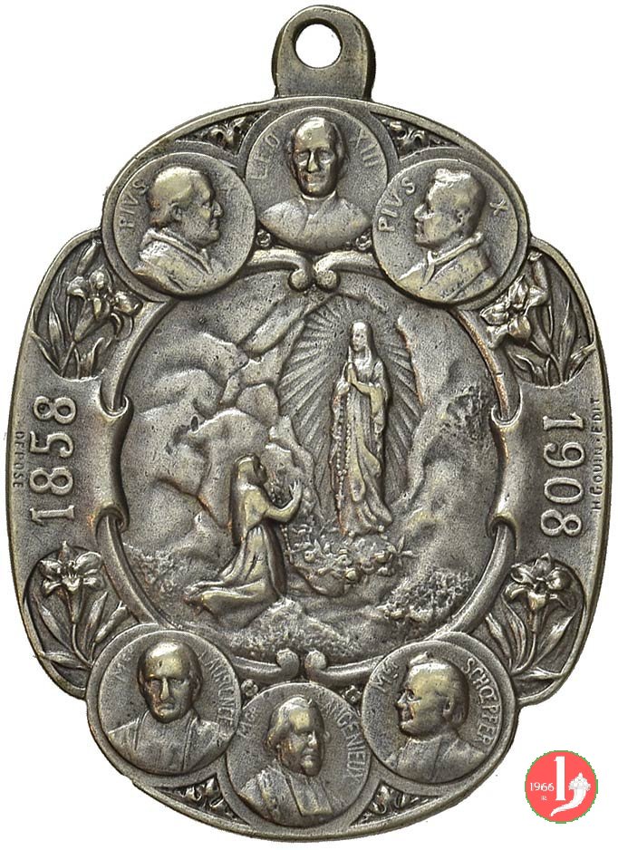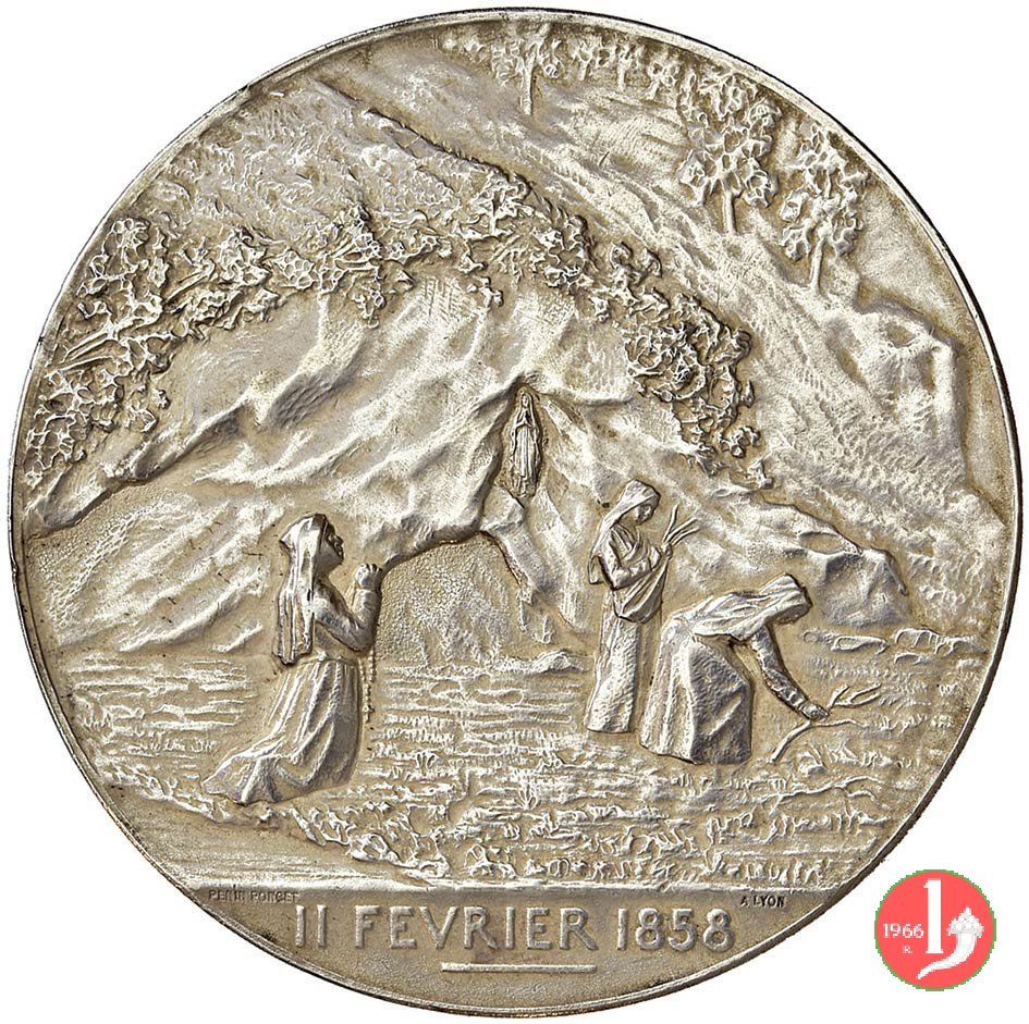 Verso: Il Papa in trono con triregno e piviale, tra i prelati e rivolto a dx, benedice folla che si dirige verso la Basilica di LOURDES e sullo sfondo a sx la Basilica di San Pietro in ROME