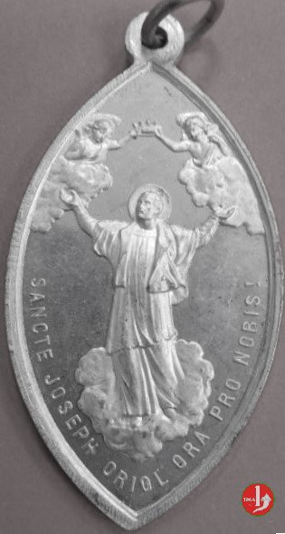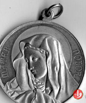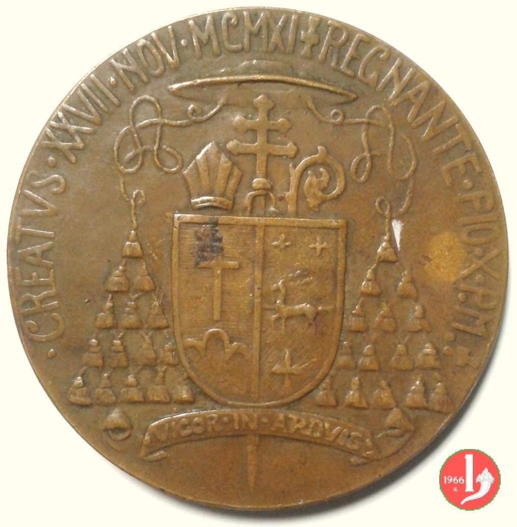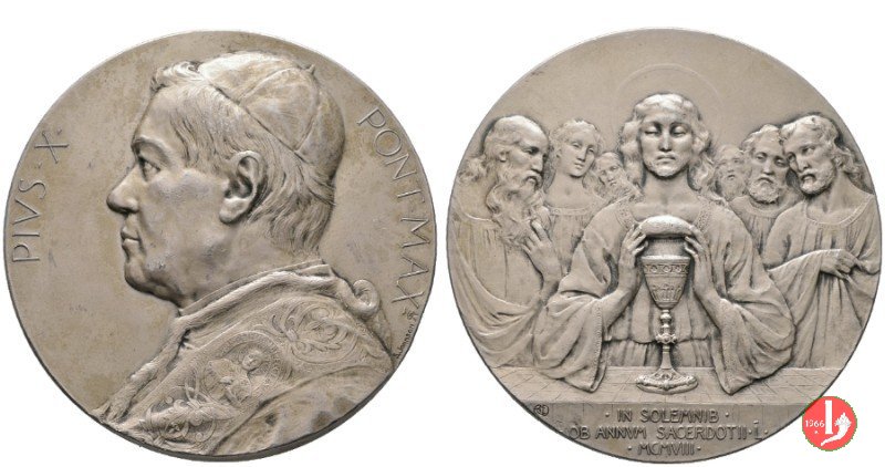 Verso: Gesú nimbato, al centro, in piedi, di fronte, regge calice e solleva ostia; ai lati: vedute interne della chiesa di Riese e della Basilica di San Pietro, in alto spighe e grappoli d'uva; sotto a sx: PRIMVM • SACRVM • FACIENTI = RIESE • MDCCCLVIII; sotto a dx: L • AN • SACERDOTALIS • ORDINATIONIS = ROMAE • MCMVIII