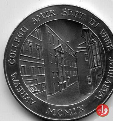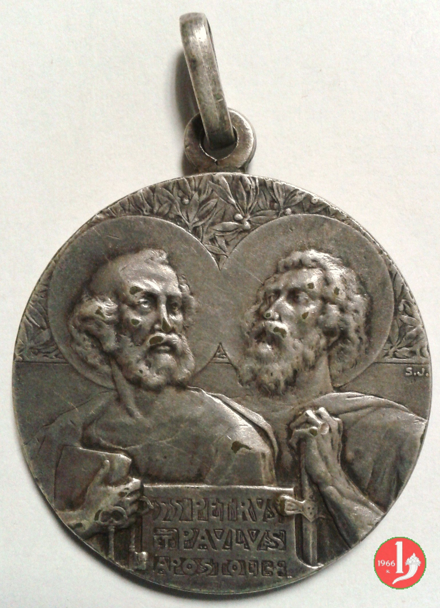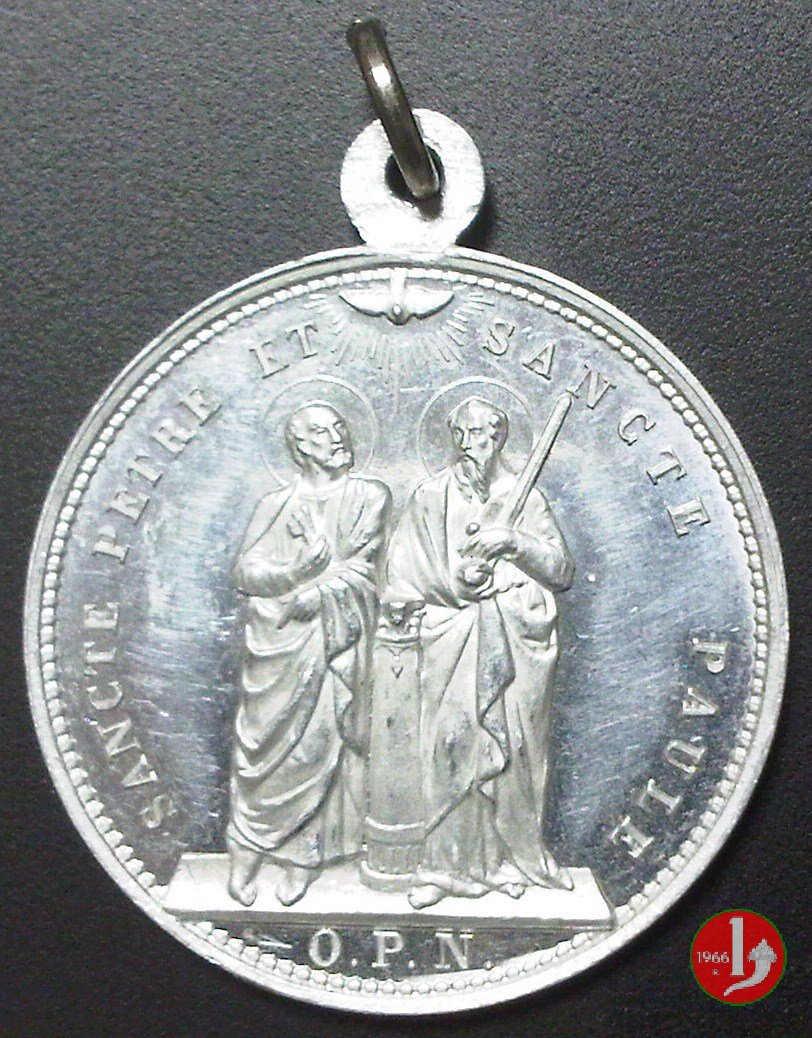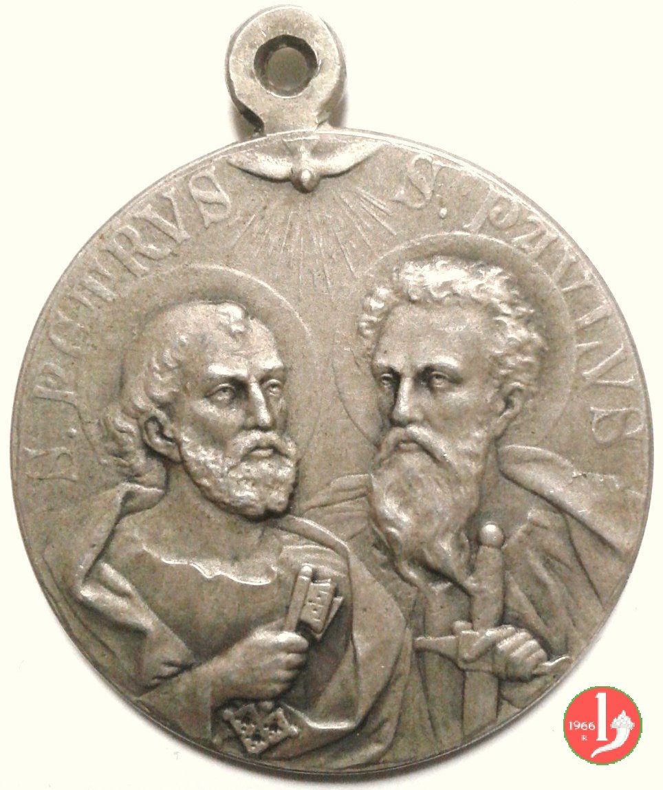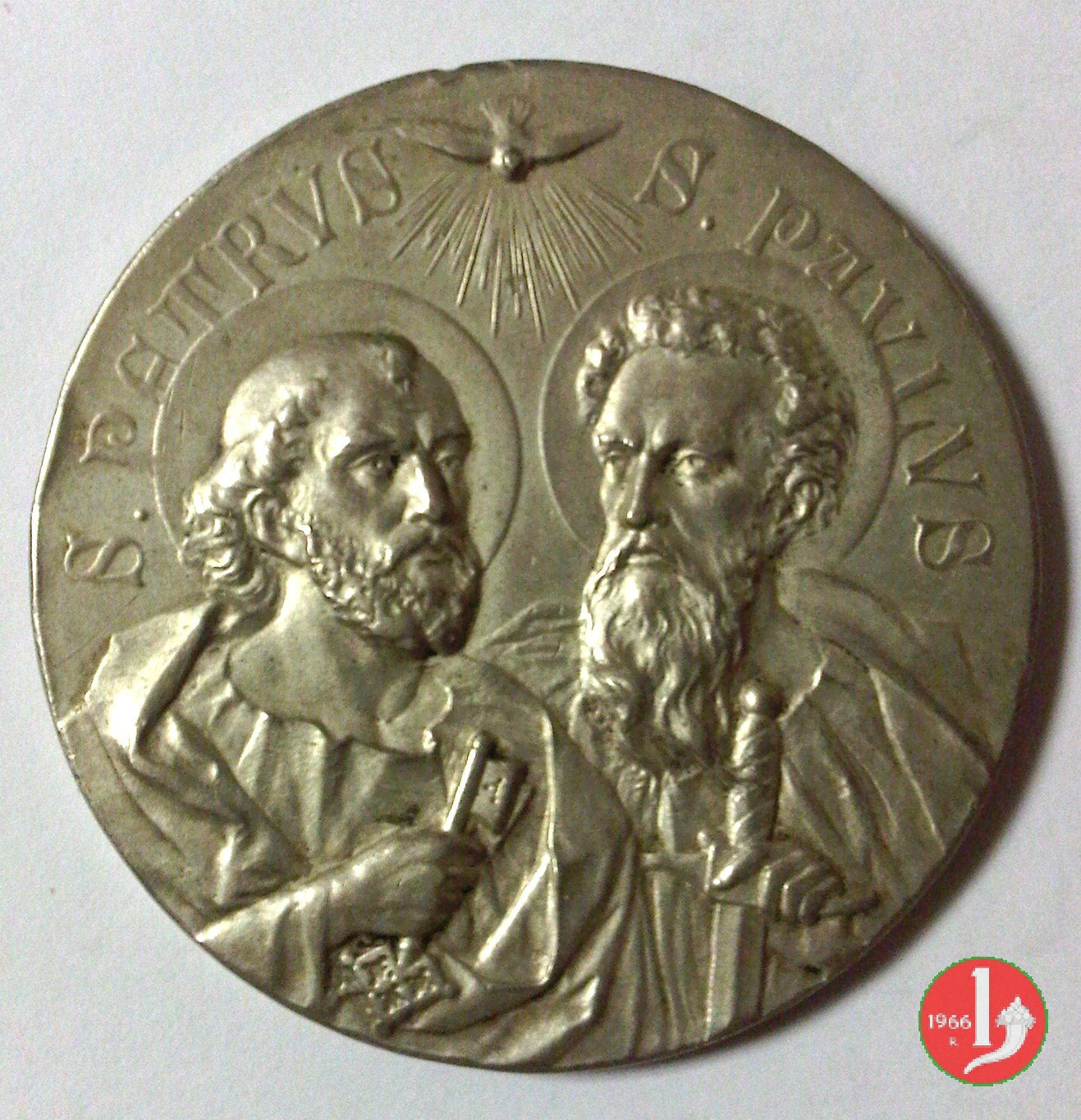 Verso: Busti nimbati dei due Apostoli affiancati reggono chiavi con Vangelo ed elsa, su mezza luna superiore in alloro