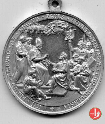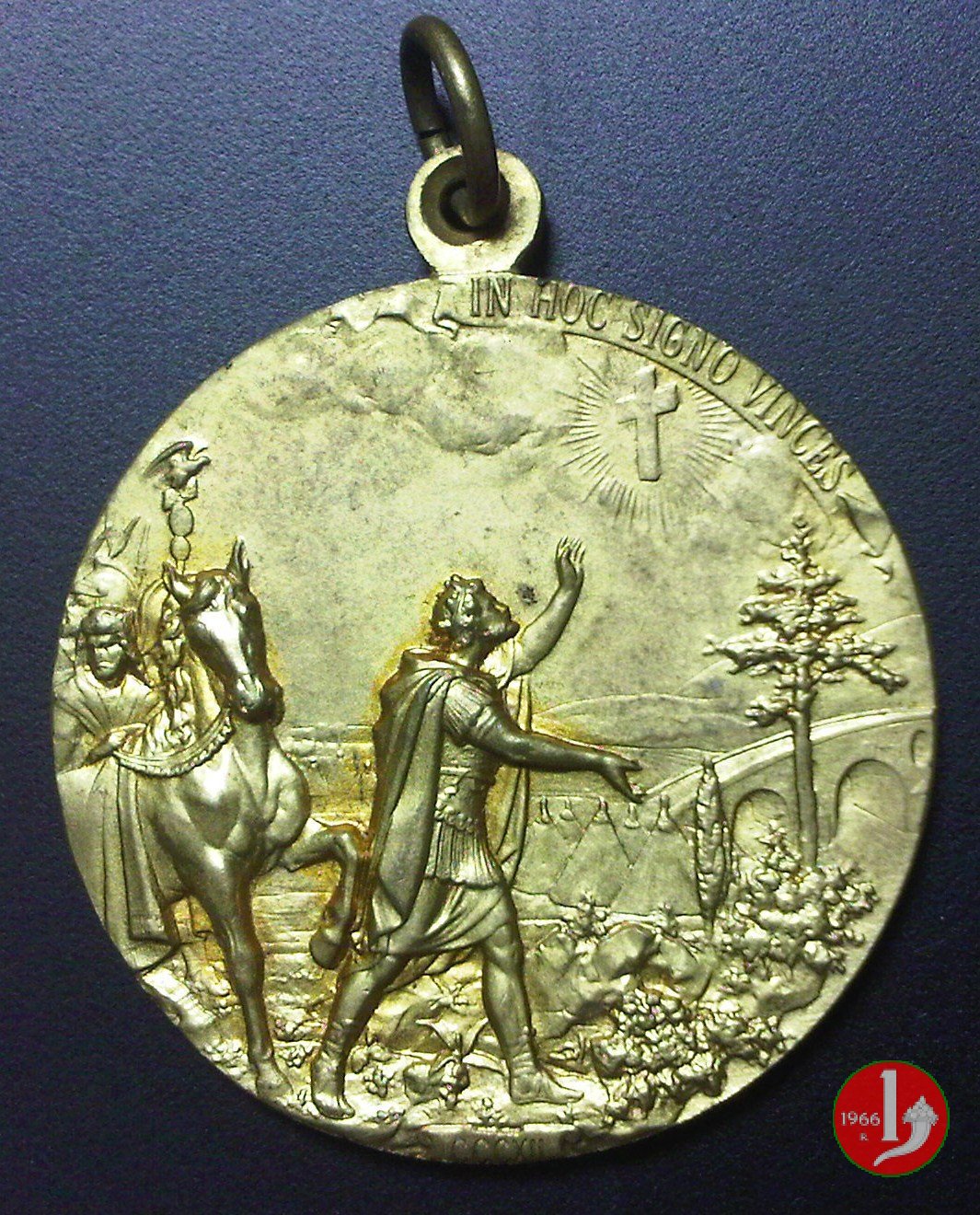 entro cornice circolare perlinata: la Visione dell'Imperatore Costantino a cavallo verso dx, mira Croce raggiante sorreta da angeli entro nastro IN TUO SIGNO VINCES