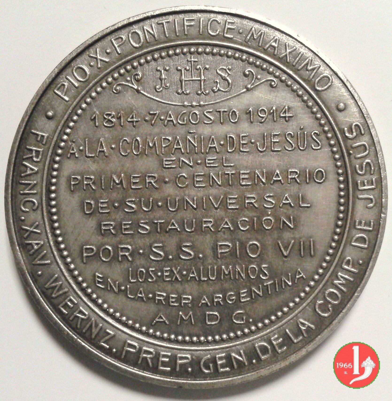 nel campo, entro cerchio perlinato: IHS su fregio = 1814 • 7 • AGOSTO • 1914 = A • LA • COMPANIA • DE • JESUS = EN • EL = PRIMER • CENTENARIO = DE • SU • UNIVERSAL = RESTAURACION = POR • S.S. PIO VII = LOS • EX • ALUMNOS = EN • LA • REP. ARGENTINA = AMDG.