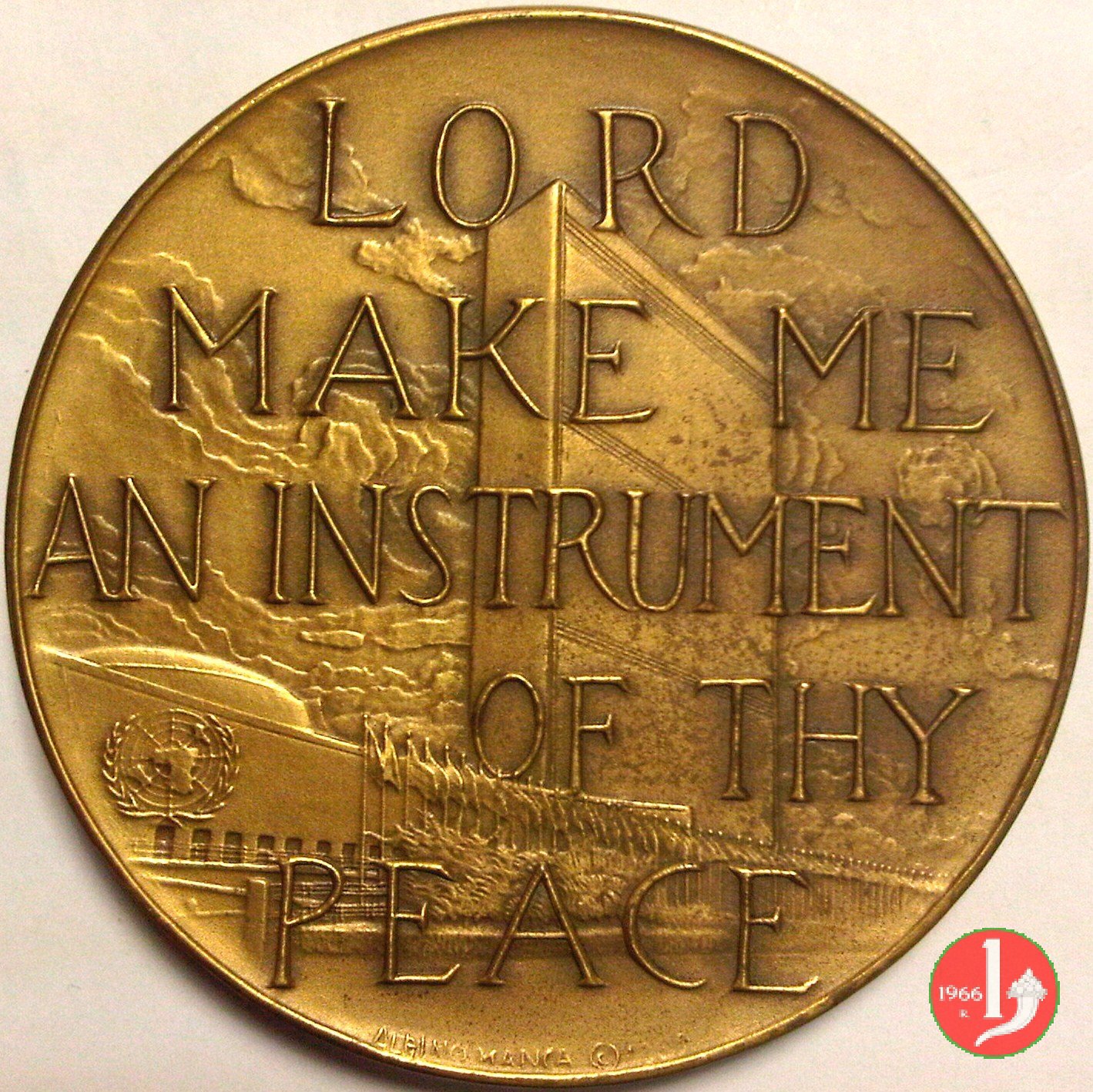 Verso: nel campo su fondo immagine del Palazzo dell'ONU : LORD = MAKE ME = AN INSTRUMENT = OF THY = PEACE