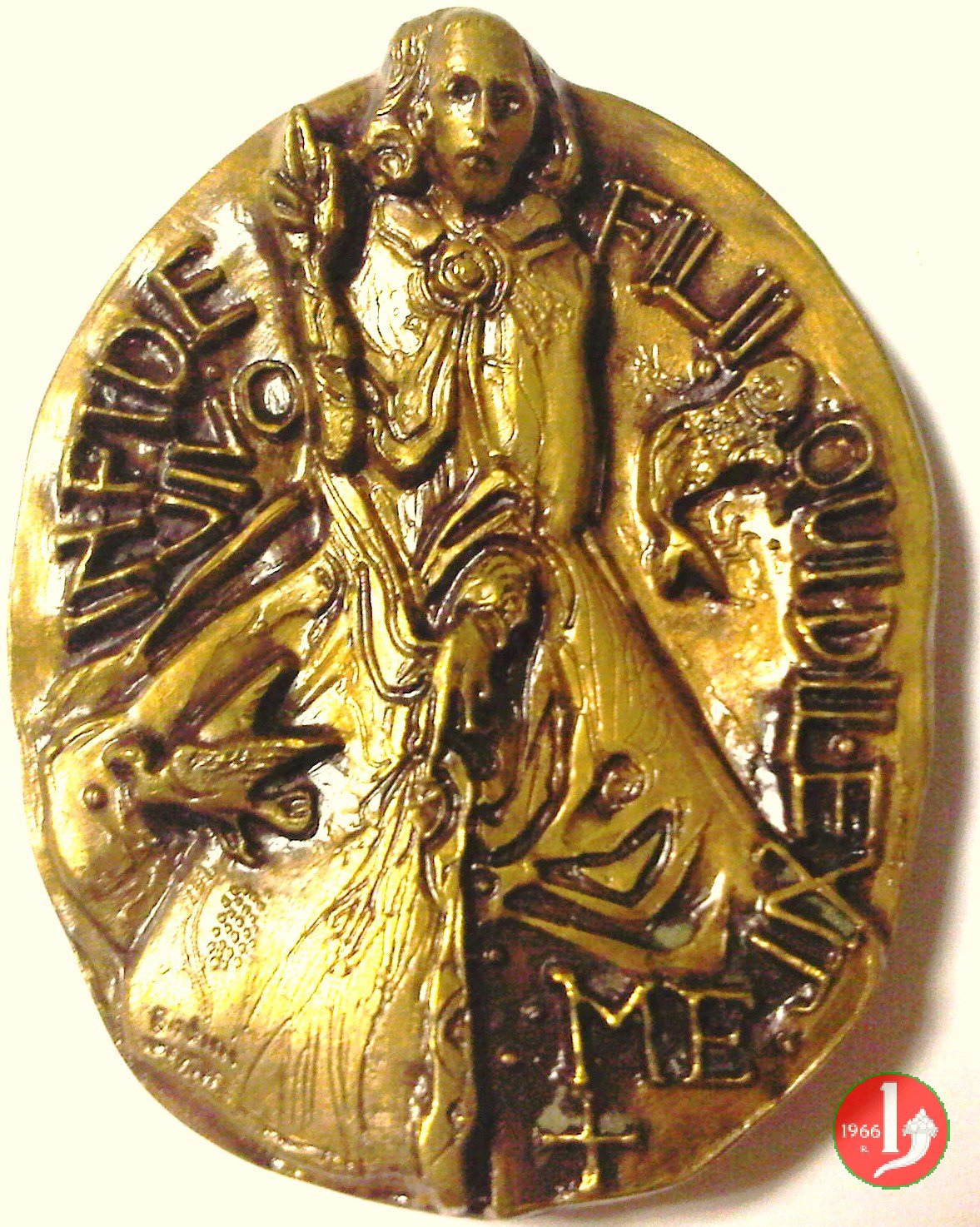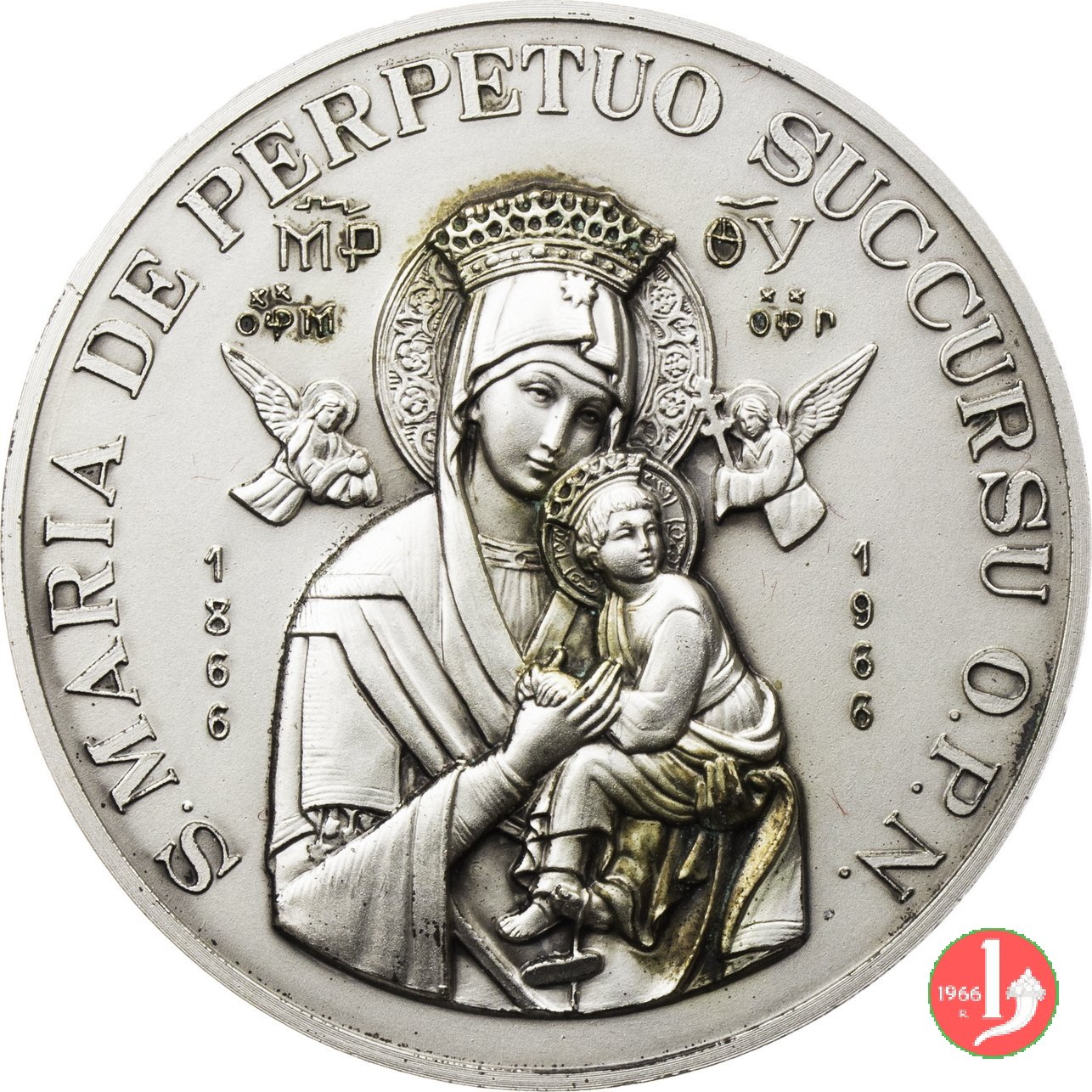 100° Madonna del Perpetuo Soccorso 50mm 1966 Obverse: PAVLVS VI _ PONT • MAX • busto a dx con berretto, mozzetta e stola sotto: DAMIANO COLOMBO & FIGLI • F • MINA • busto della B. v. Maria nimbata, coronata e velata tra due Angeli sorregge il Bambino Gesú nimbato e coronato ai lati verticalmente: 1866 _ 1966 |