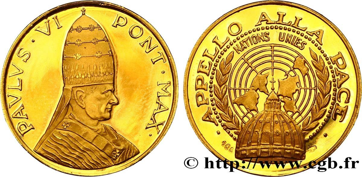 Visita all'ONU - Appello alla Pace Obverse: PAVLVS • VI _ PONT • MAX • busto a dx con triregno, pallio e fanone entro cerchio perlinato interrotto in basso: cupola della Basilica di San Pietro su Logo NATIONS UNIES |