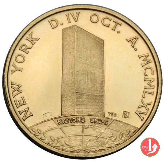 Visita all'ONU - Palazzo ONU 1965 Obverse: PAVLVS VI _ PONT. MAX. busto a sx con triregno e piviale in basso: R. SIGNORINI Vista del palazzo delle Nazioni Unite su logo dell'ONU NATIONS UNIES e sotto rami d'alloro nel campo a dx: NLT |