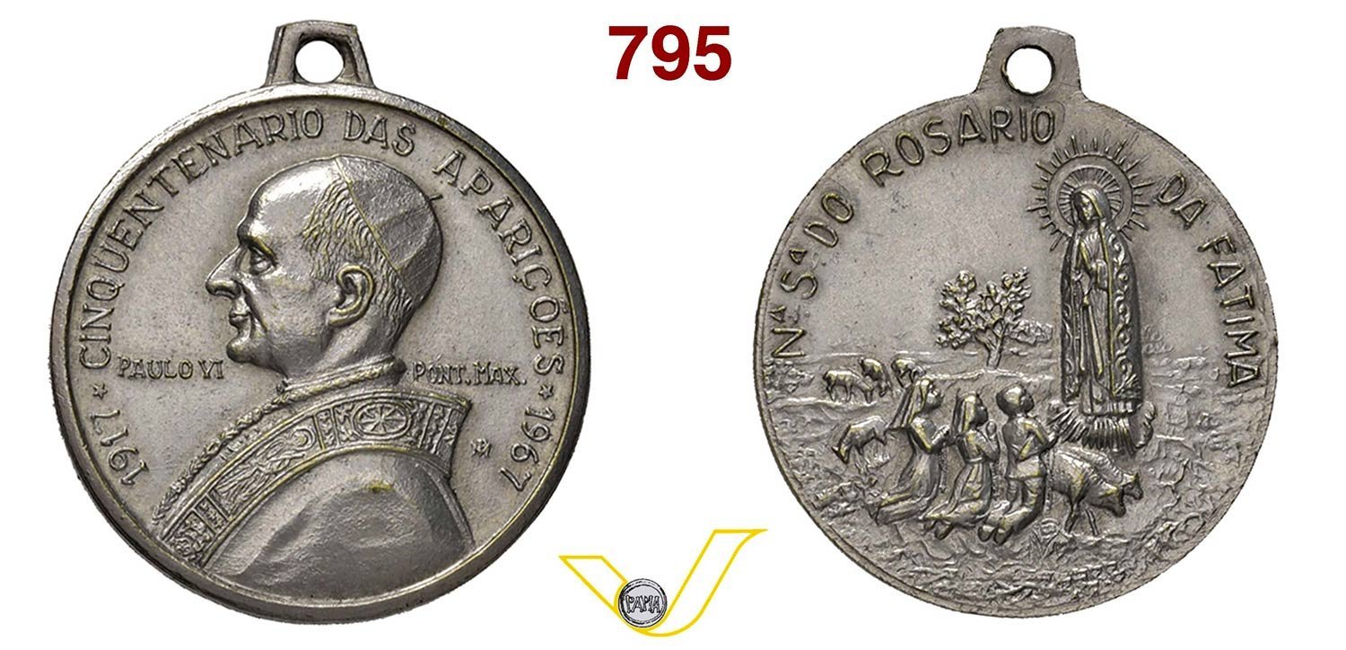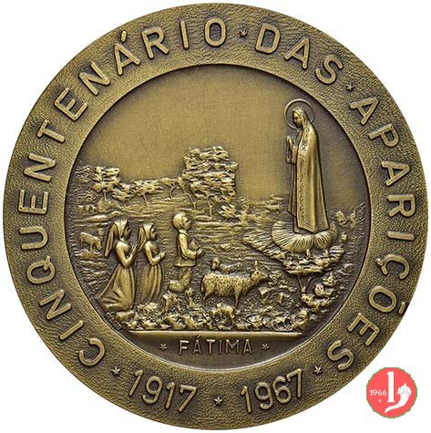 Fatima Peregrinacao da Paz 13-05-1967 Obverse: • PAVLVS • VI _ • PONT • MAX • busto a dx con berretto, mozzetta e stola sotto: JOAQUIM CORREIA _ MAIO 1968 I Tre Pastorelli, genuflessi verso dx, mirano l'immagine della B. V., tra semilune, su cespuglio |