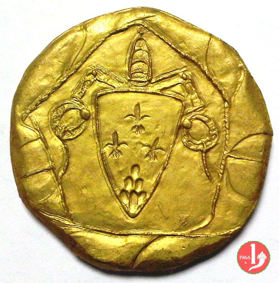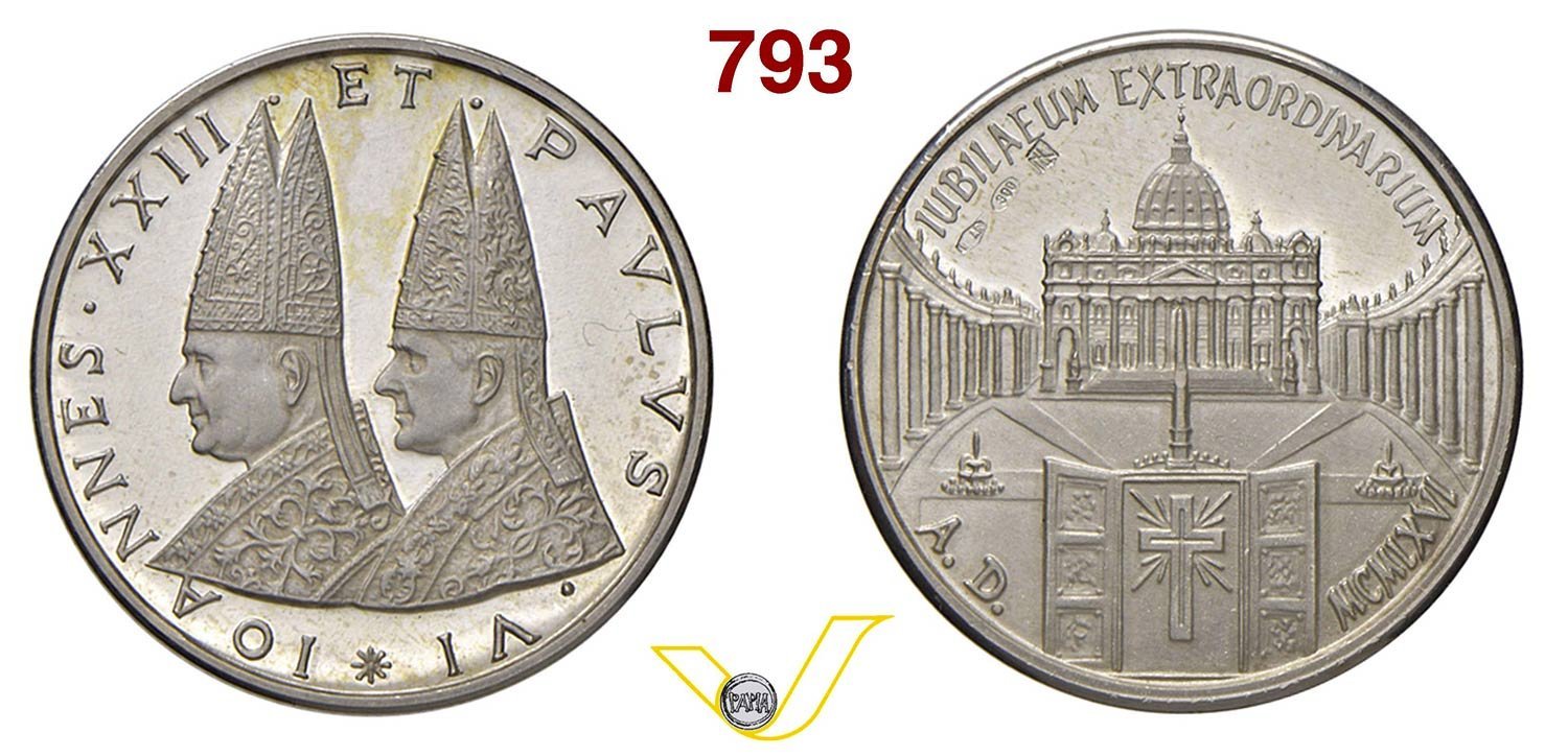 Giubileo Straordinario 1966 Obverse: IOA _ NNES • XXIII • _ ET • _ PAVLVS _ • VI * busti accollati a sx con mitre e piviali Piazza San Pietro e sotto il prospetto della Porta Santa aperta in basso |