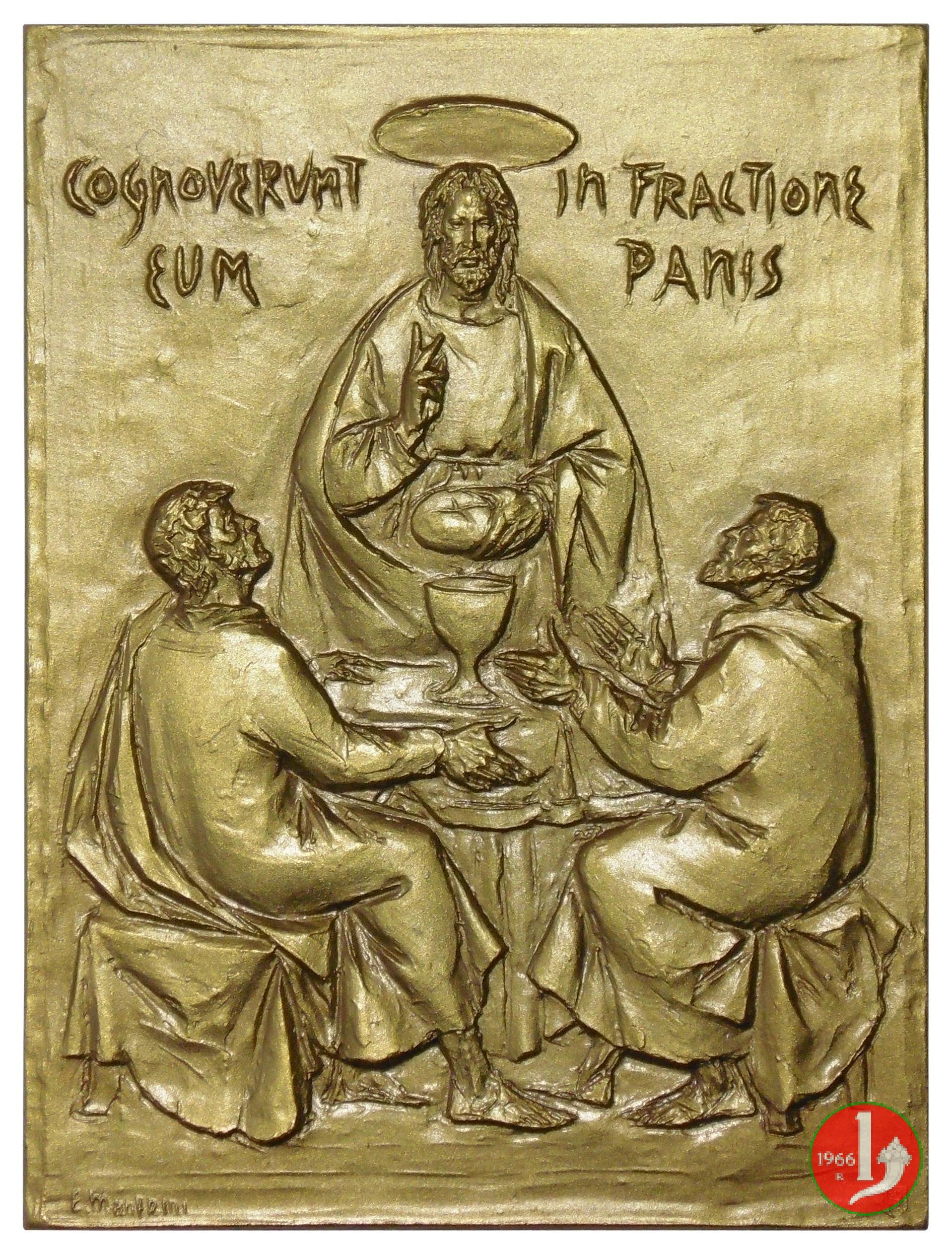Pasqua 1968 -C76 Obverse: Gesú nimbato, benedicente, in piedi, di fronte, davanti a tavola con calice, spezza il pane tra due uomini seduti su sgabelli nel campo, in alto: COGNOVERVNT _ IN FACTIONE = EUM _ PANIS in basso, a sx: E. MANFRINI |