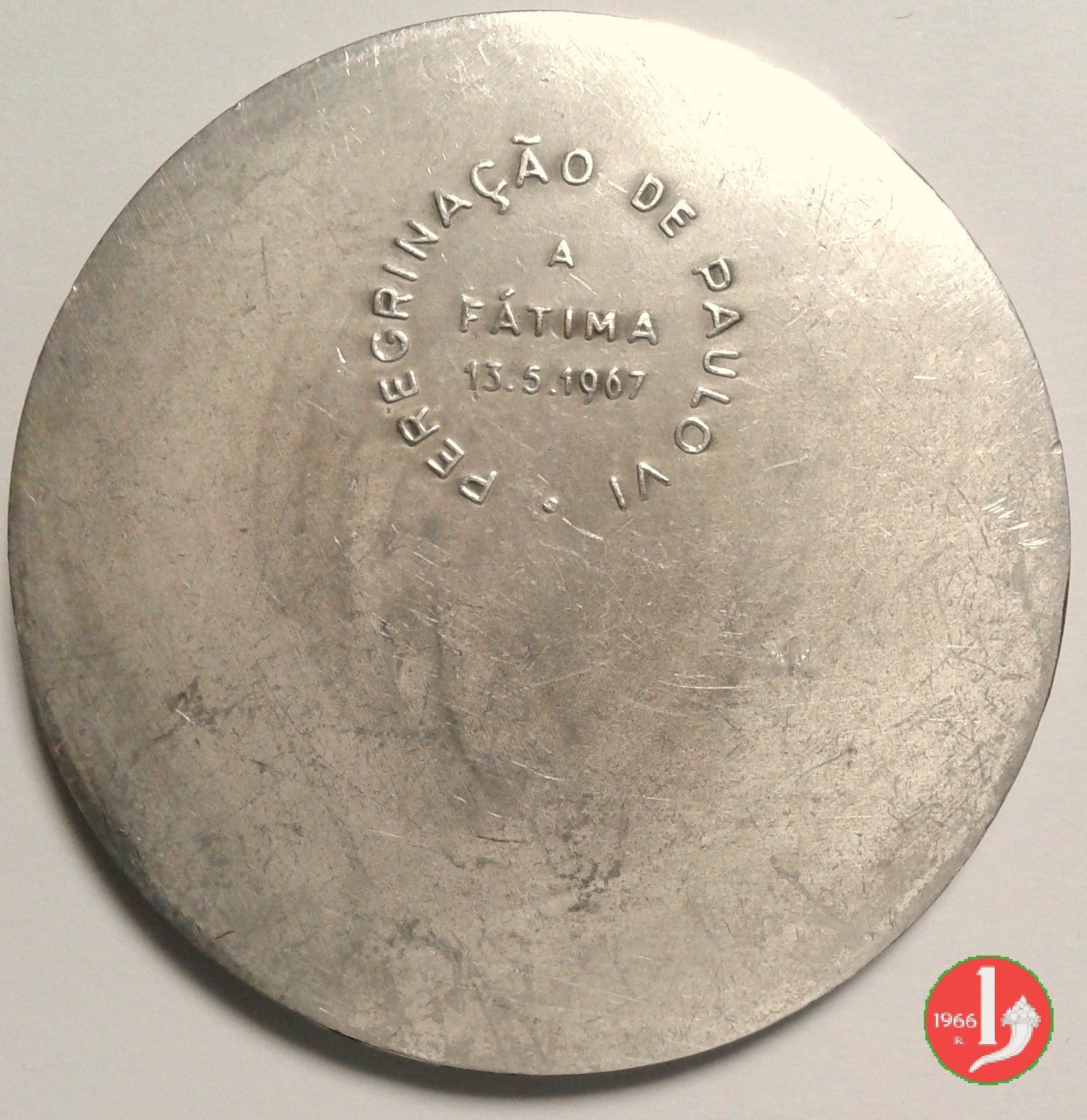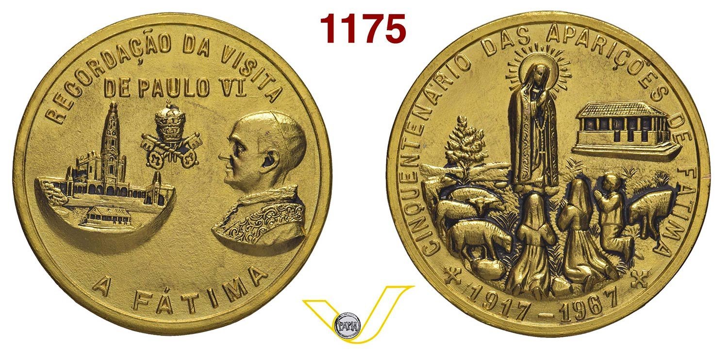 Ricordo Visita a Fatima 13-05-1967 Obverse: RECORDACAO DA VISITA in alto: DE PAULO VI Vista della Basilica, Triregno su chiavi decussate e busto a sx di Paolo VI in basso circolarmente: A FATIMA i tre Pastorelli, genuflessi e oranti di fronte l'Immagine della B. V. Maria |