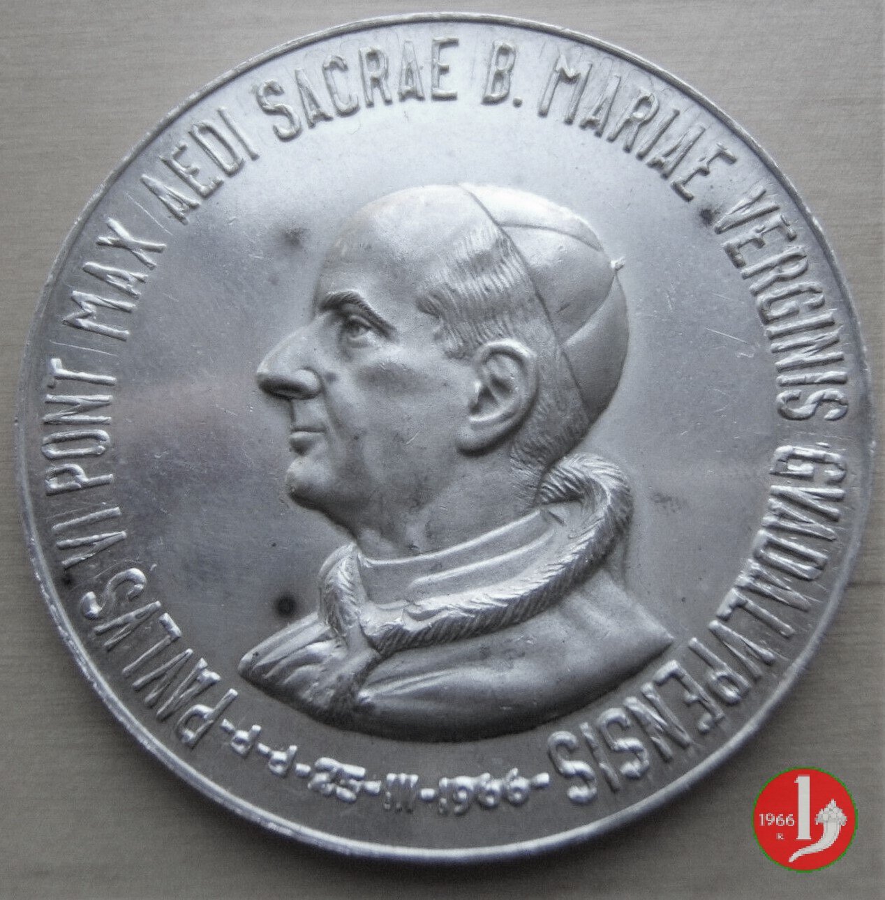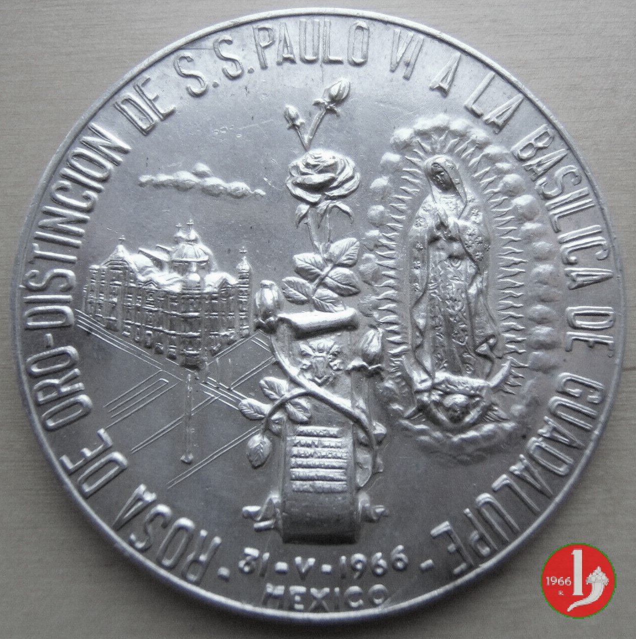 Rosa d'Oro al Santuario N.S. Guadalupe e Diocesi Mexicani 25-3-66 -MM204 Obverse: PAVLVS VI PONT MAX AEDI SACRAE B. MARIAE VIRGINIS GVADALVPENSIS busto a sx con berretto, veste talare e mantellina d'ermellino sotto: -d-d-25-III-1966- da sx: vista della Cattedrale di Mexicani; pianta di rosa su cartiglio; la B. V. di Guadalupe volta di 3/4 a sx sotto: 31 - V - 1966 = MEXICO |
