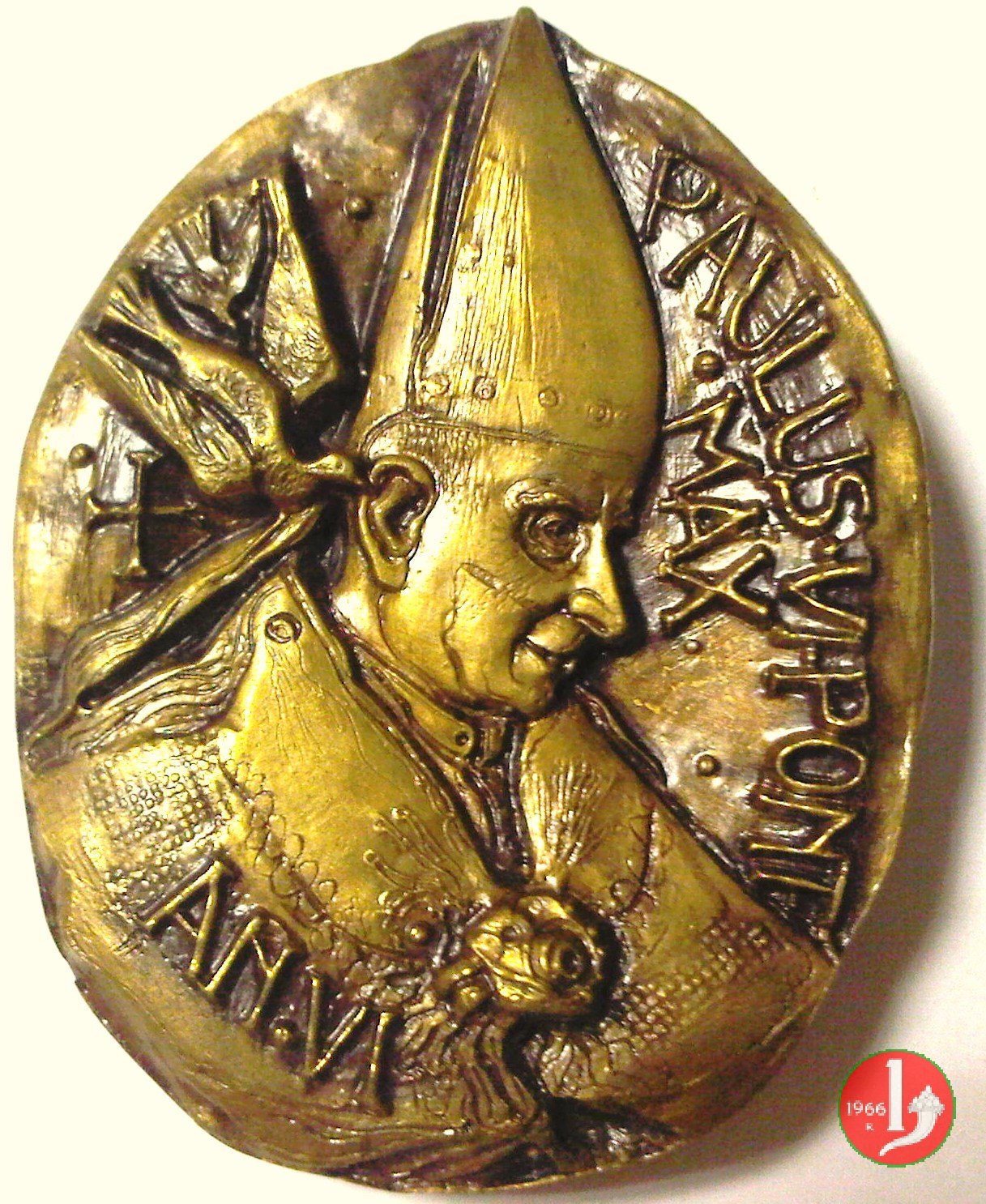 A. VI - Incremento Vocazioni Sacerdotali -MM240 Obverse: a dx: PAVLVS • VI • PONT • = • MAX busto a dx con mitra e piviale e a sx colomba e Croce in basso, sul piviale: AN.VI presso il bordo a sx: FB figura benedicente, di fronte, con piviale, tra colomba e pesce in basso a sx, sul piviale: BODINI |