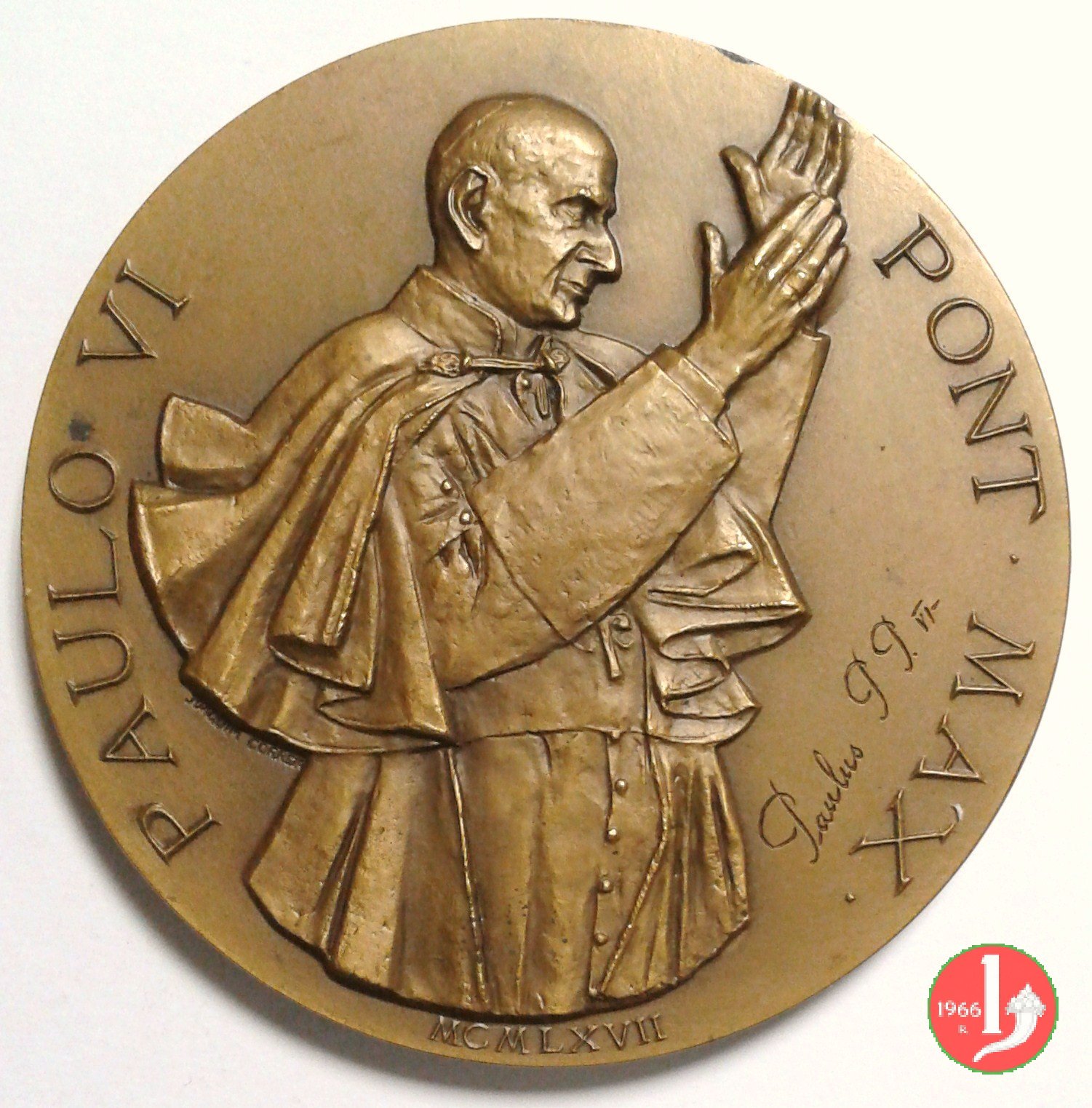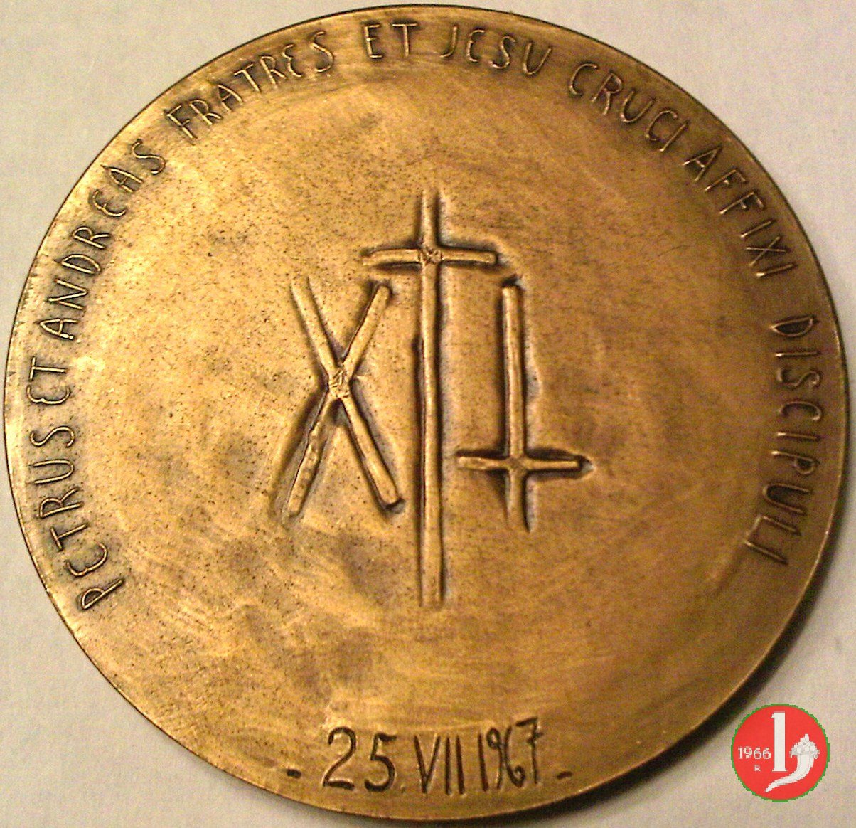 1900° Martirio SS. Apolstoli -MM228 Obverse: PAVLVS • VI • PONTIFEX • MAXIMVS busto a dx con berretto, mozzetta e stola sotto: GIAMPAOLI San Pietro genuflesso sorregge la Basilica Vaticana e riceve da sx le chiavi del Regno dei cieli nel campo a dx: A.D. = 67 = A.D. = 1967 in basso: PAGANI |