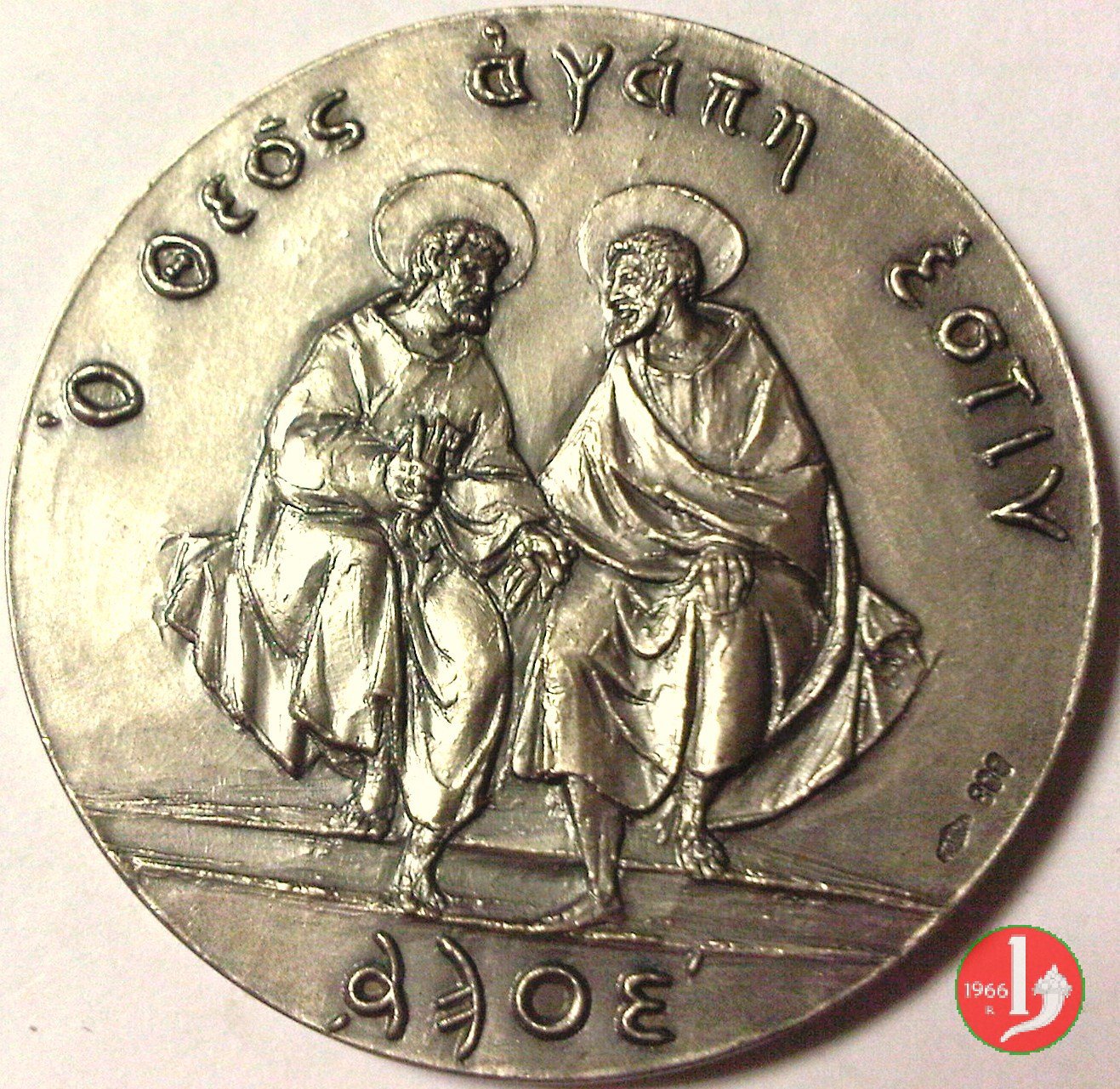 Dichiarazione Cattolico-Ortodossa 07-12-1965 -MM190 Obverse: AMBULATE IN DILECTIONE Paolo VI e Atenagora in piedi si abbracciano sotto: A.D. MCMLXV. in basso a dx: E. MANFRINI San Pietro con chiavi e Sant'Andrea con mantello seduti di fronte nimbati e affrontati, si stringono la mano in esergo: |