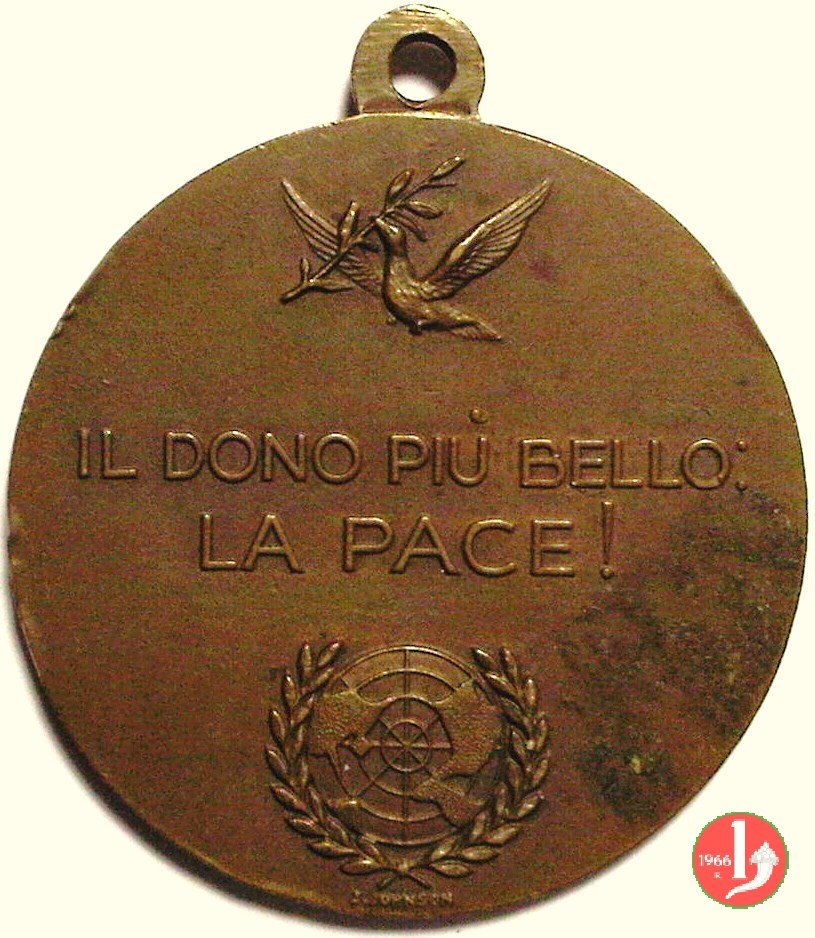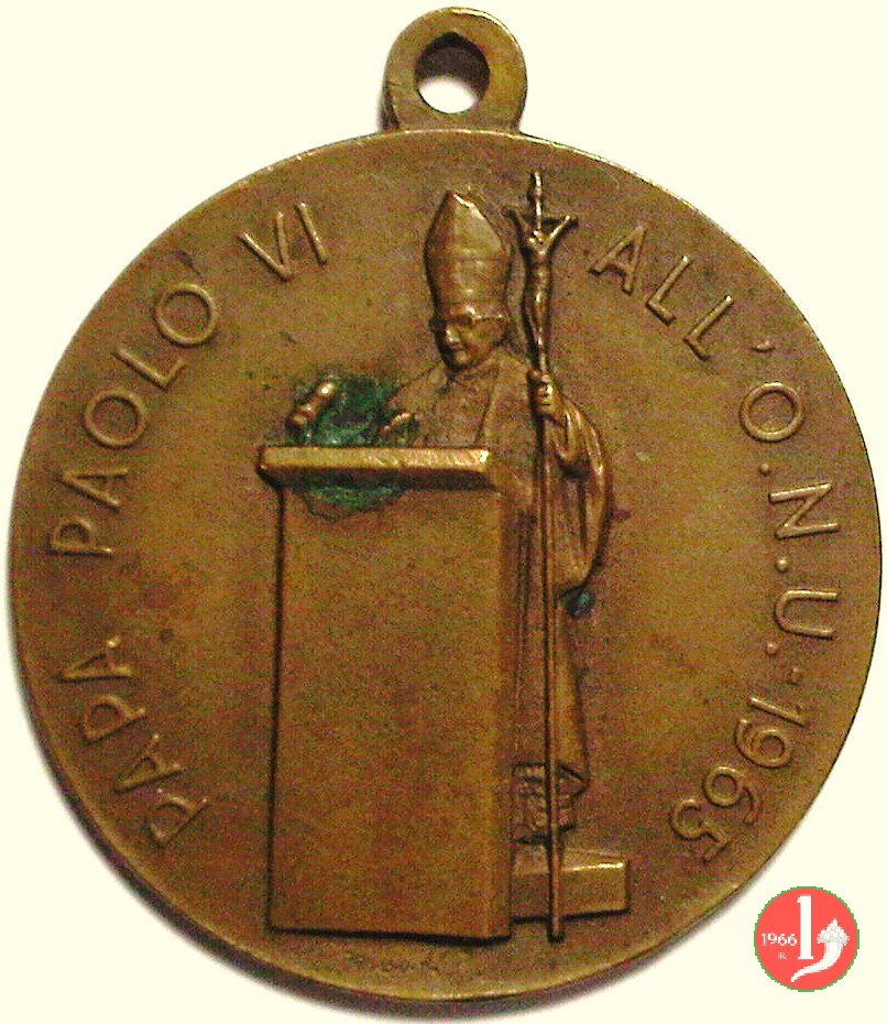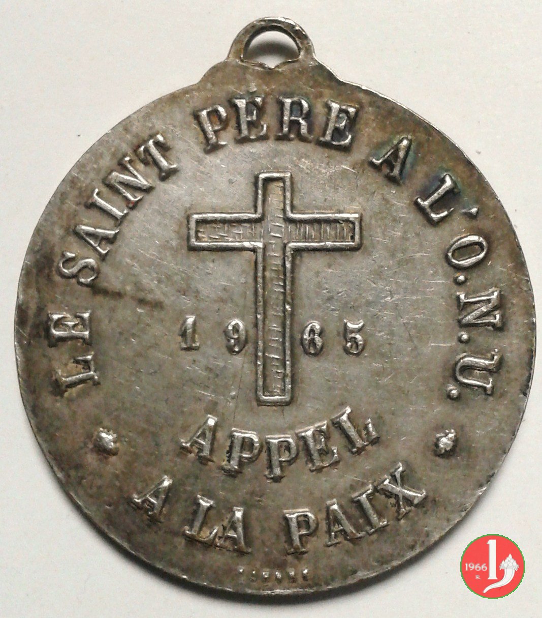 Visita all'ONU - Appel a la Paix Obverse: entro cornice d'alloro sormontata da tre anelli intrecciati: busto fotografico di Paolo VI di fronte Reverse: • LE SAINT PERE A L' O.N.U. • Crocefisso ai lati: 19 _ 65 sotto: APPEL = A LA PAIX |