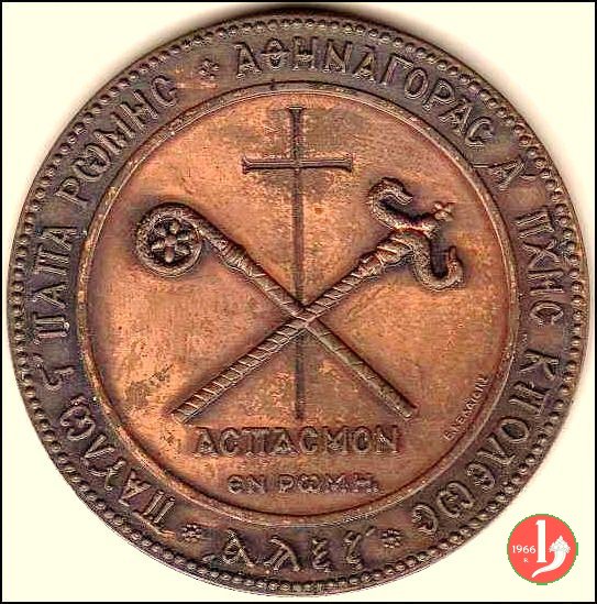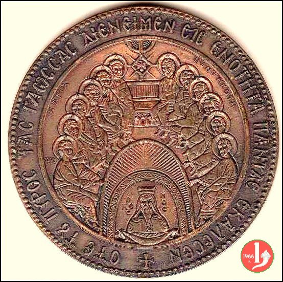 Incontro con Athenagora -MM231 Obverse: PAYAW SINANA PWMHG AOHNA • ASHNATOPAC A ![]() ![]() ![]() ![]() pastorali decussati su Croce sotto: AC in basso a dx: E. KEDAIAHE nel cerchio interno in cirillico: LA SANTA _ PENTECOSTE I dodici apostoli seduti attorno ad un tavolo, in alto lo Spirirto Santo, sotto Gesú entro nicchia (COSMOS) |