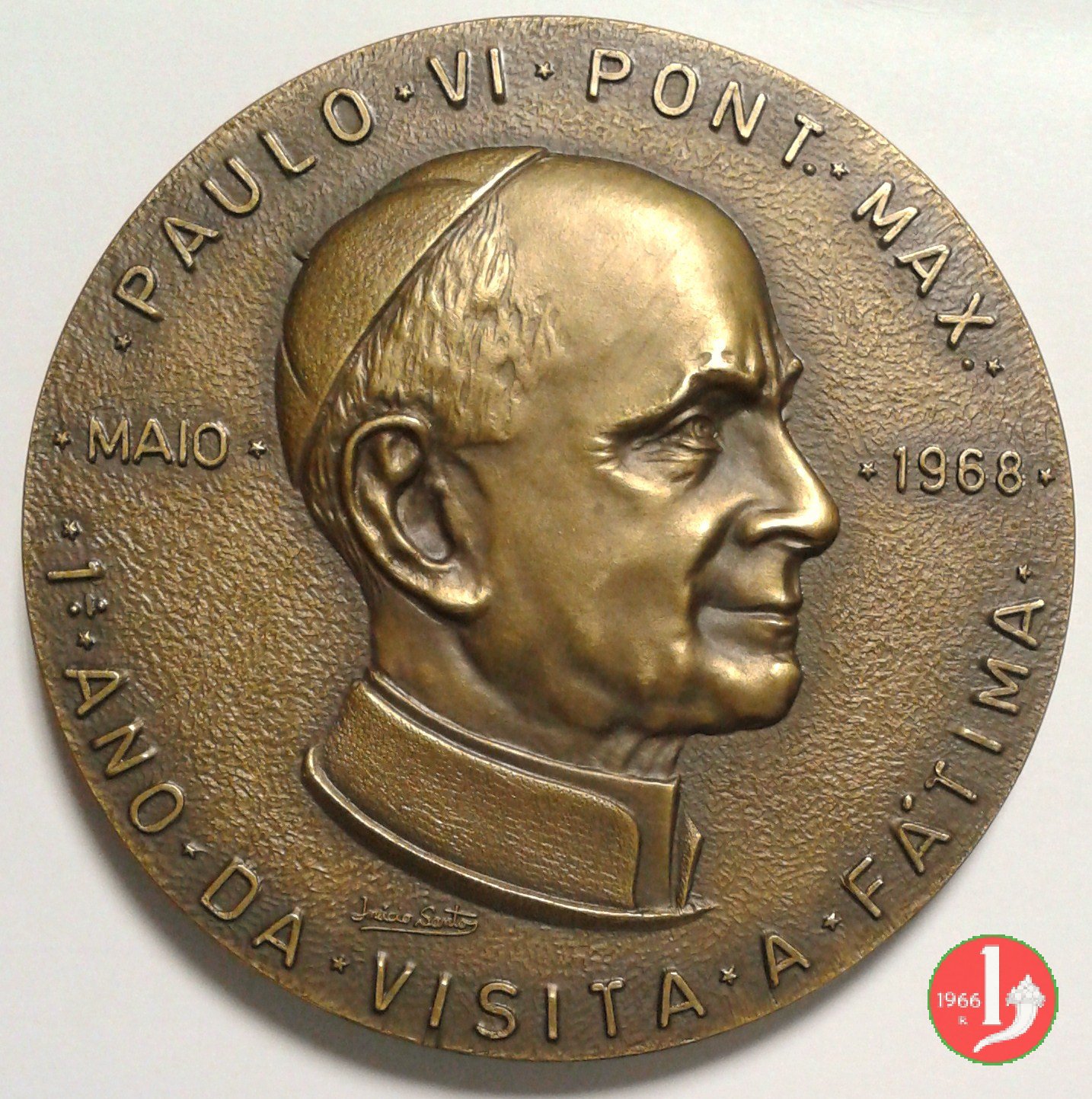 Anniversario della Visita a Fatima 13-05-1968 Obverse: * PAULO * VI * PONT. * MAX. * busto a dx con berretto e veste talare ai lati: * MAIO * _ * 1968 * sotto al busto, corsivo: JNIACIO SANTO in basso: * 1° * ANO * DA * VISITA * A * FATIMA * i tre pastorelli genuflessi di fronte (di schiena) mirano nubi dalle quali esce Angelo nimbato che regge pisside con ostia |
