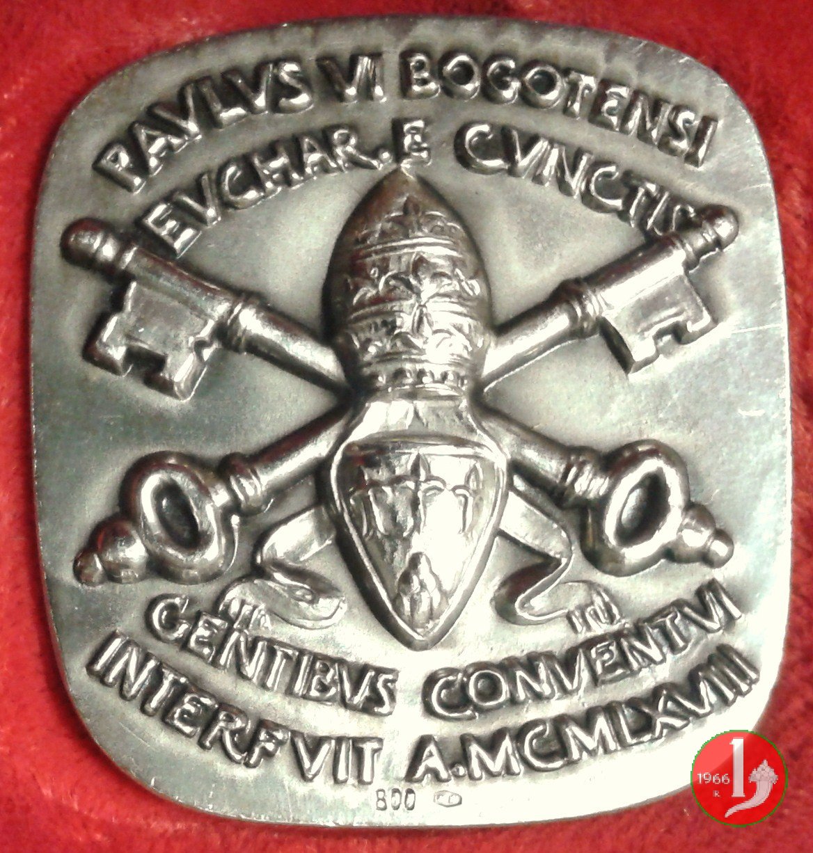 Viaggio a Bogotà 22-08-1968 -ridotto Obverse: PAVLVS VI BOGOTENSI = EUCAR. E CVNCTIS Stemma Papale coronato da triregno su grandi chiavi decussate sotto: GENTIBVS CONVENTUI = INTERFUIT A. MCMLXVIII Busto di Gesú di fronte mentre spezza il Pane in basso a dx: MESSINA |