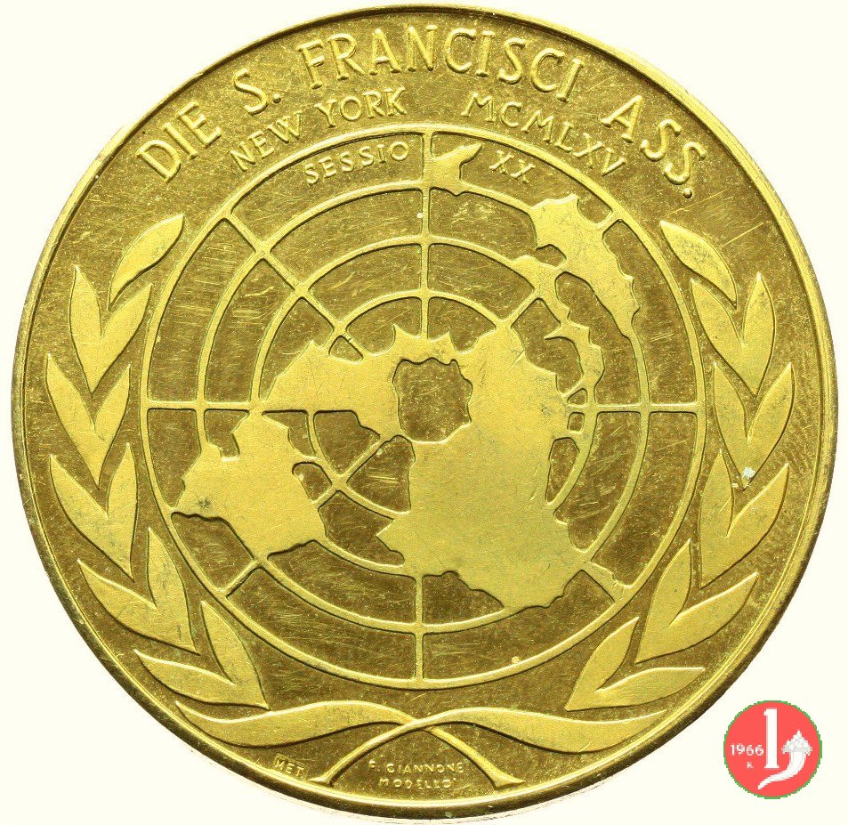 Visita all'ONU-Nvntivs Pacis Americae -MM182 Obverse: NVNTIVS • PACIS • AMERICAE • VOLAT _ AD _ ORAS = - PAVLVS PP. VI • 4 • 10 • 1965 - busto di 3/4 a dx, a braccia aperte, con berretto e cappotto; in alto aereo in volo verso dx in basso: monogramma Ff Stemma dell'ONU tra rami d'alloro in basso: PEACE • PAIX • PAX • MNP |