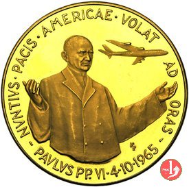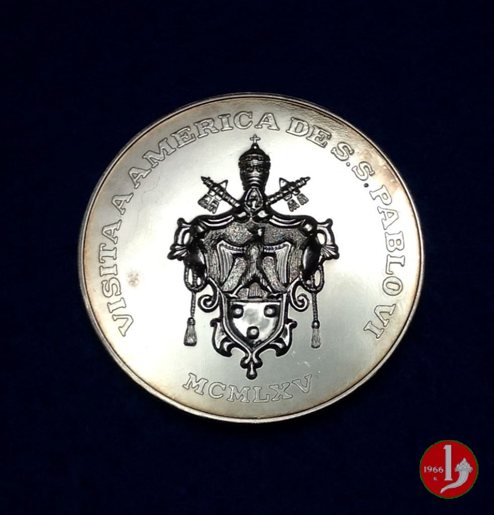Visita in USA 04-10-1965 Obverse: busto di 3/4 a dx con berretto, veste talare e Croce pettorale (catena) sul taglio del busto: TP Stemma di Pio XI (!?!) con aquila ad ali spiegate su campo con tre palle, sormontato da triregno e chiavi decussate in basso: MCMLXV |