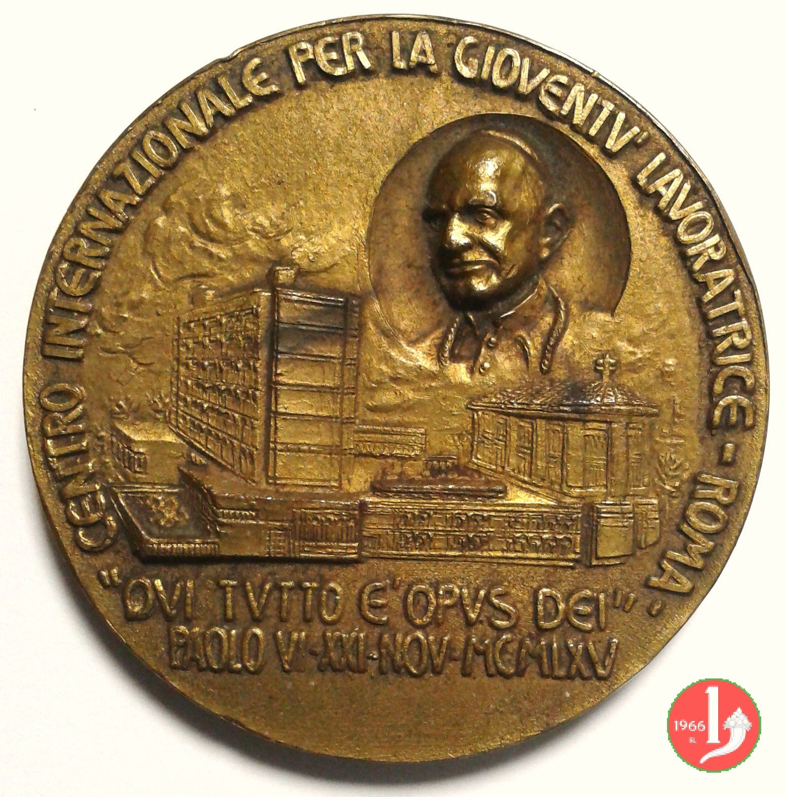 Centro Inter. Gioventú Lavoratrice Roma 22-11-65 -MM189 Obverse: CENTRO INTERNAZIONALE PER LA GIOVENTU' LAVORATRICE - ROMA vista del complesso in alto, a dx, entro medaglia: busto di 3/4 a sx di Paolo VI con berretto, veste talare e Croce pettorale in esergo: "QVI TVTTO E' OPVS DEI" = PAOLO VI • XXI • NOV • MCMLV in basso, a dx: in alto: Stemma di Paolo VI tra quello di Pio XIII e quello di Giovanni XXIII, tutti su chiavi decussate e coronati da triregni sotto, nel campo: SVB PAVLO VI P.M. IN = FIDEM PERDVCTVM ET = AVGVSTA EIVSDEM = SVMMI PONTIFICIS = PRAESENTIA INAV. = GVRATVM |