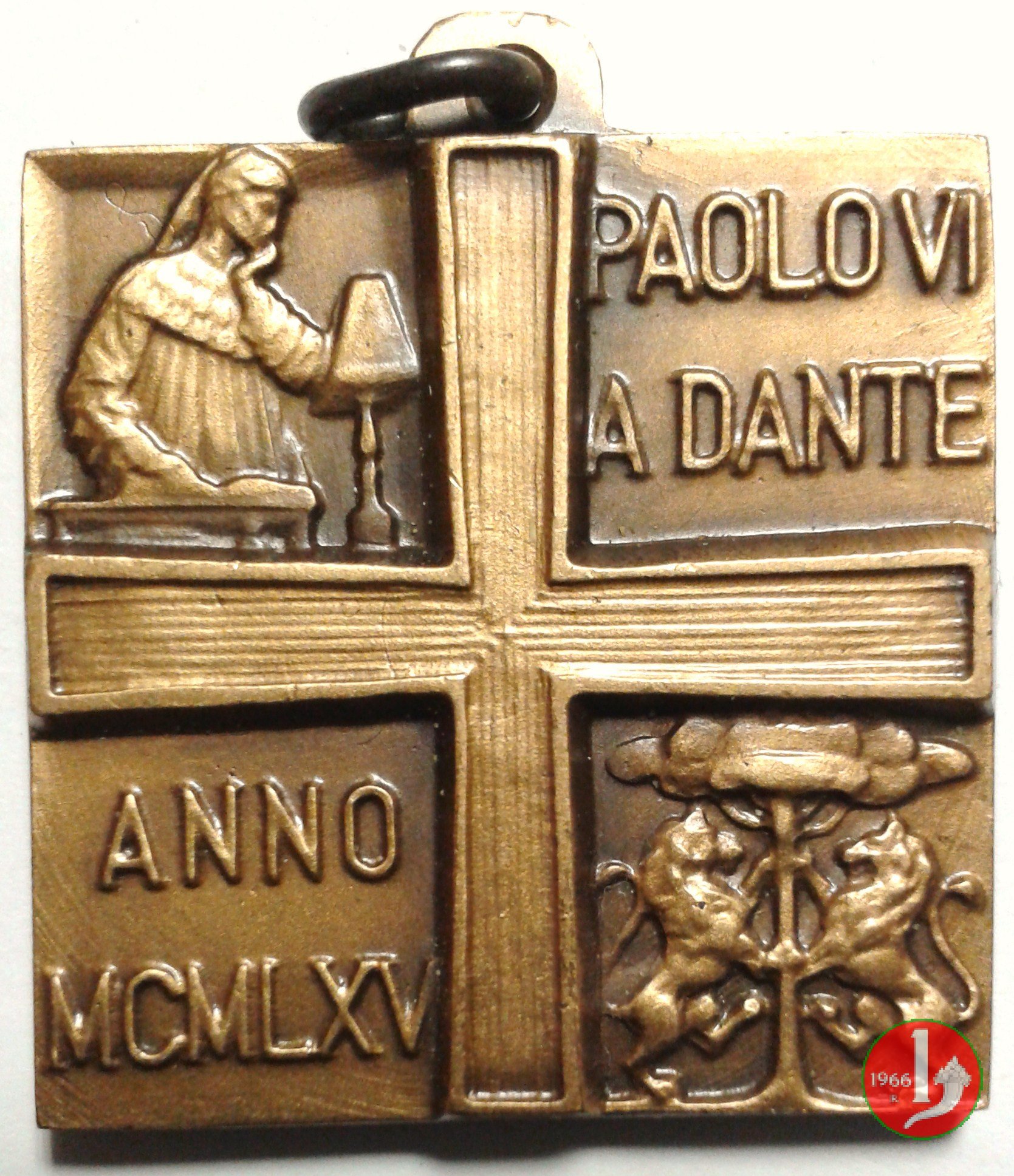 Dante Alighieri - Altissimi Cantus 07-12-1965 Obverse: con tenuta tra due cornici continue: TUTTO SERAFICO IN ARDORE busti accollati a sx di Dante Alighieri con cappuccio e di San Francesco con saio nel campo a dx: ICN in basso: nodo Croce divide il campo in quattro | |