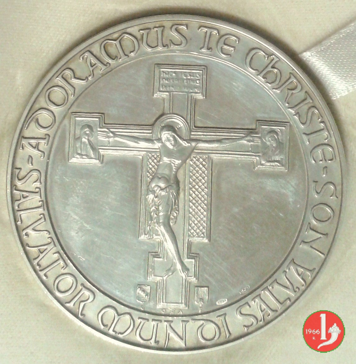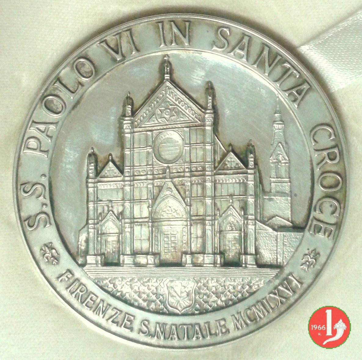 Viaggio a Firenze-Basilica S. Croce - MM212 Obverse: S.S. PAOLO VI IN SANTA CROCE = * FIRENZE S. NATALE MCMLXVI * Vista anteriore della Basilica di Santa Croce in Firenze in esergo: stemma a scudetto dell' Ordine dei frati minori conventuali in campo crociato Il Crocifisso di Cimabue conservato all'interno della Basilica con ai lati della base due stemmi sotto: G _ OPA _ F |