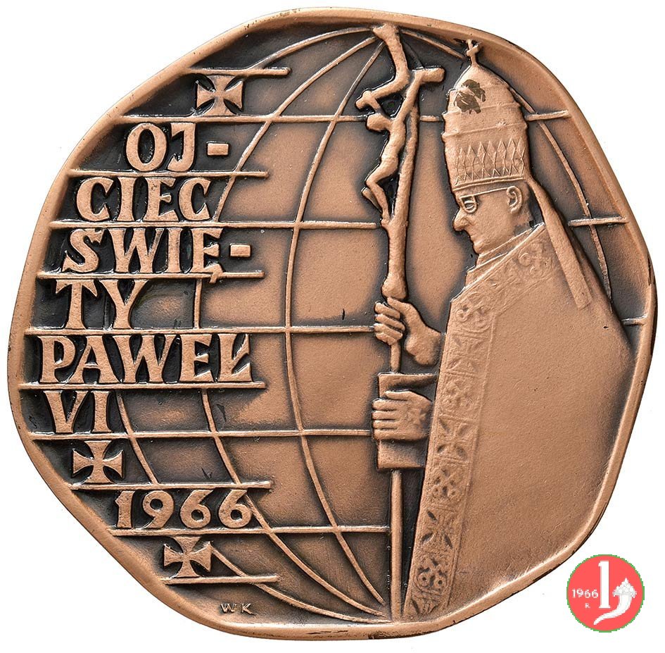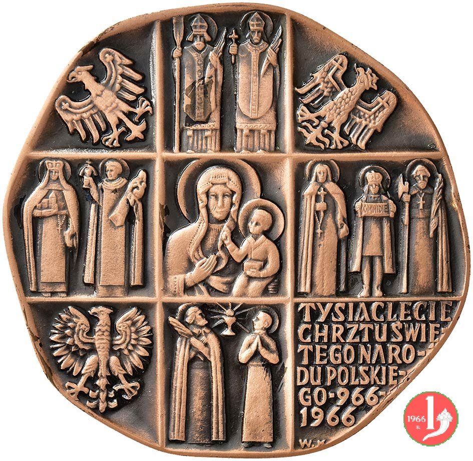 Millenio del Cristianesimo in Polonia -MM215 Obverse: su emisfero: busto a sx con triregno, piviale e pastorale nel campo a sx: ✠ = OJ- = CIEC = SVIE = TY = PAWEL = VI = ✠ = 1966 = ✠ in basso: WK al centro: l'immagine della B. V. col Bambino sui bracci: figure di Santi in piedi tra i bracci: aquile tra i bracci in basso a dx: TYSIACLECIE = CRZTU SWIE- = TEGO NARO- = DU POLSKIE- = GO • 966 • = 1966 sotto: W. K. |