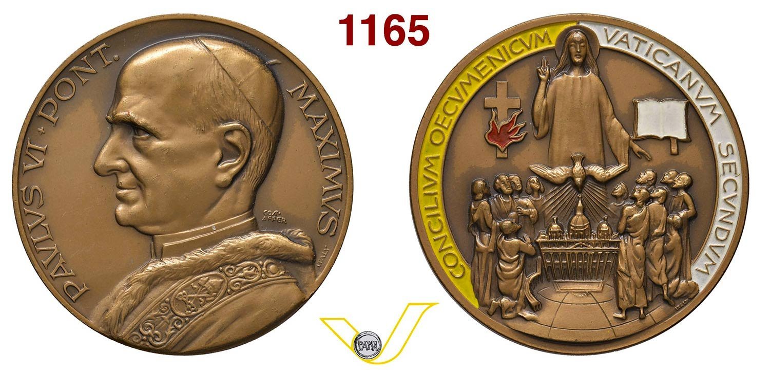 Concilio Ecumenico Vaticano II -MM544/546 Dritto: PAVLVS VI • PONT. _ MAXIMVS busto a sx con zucchetto, mozzetta e stola nel campo a dx: COST. = AFFER in basso a dx: ITALY Il Papa in trono, benedicente con triregno e piviale, irraggiato dall'alto dalla Colomba dello Spirito Santo, tra le mitre dei Vescovi e Cadinali riuniti in conclave in basso a dx, sotto al trono: VARISCO |